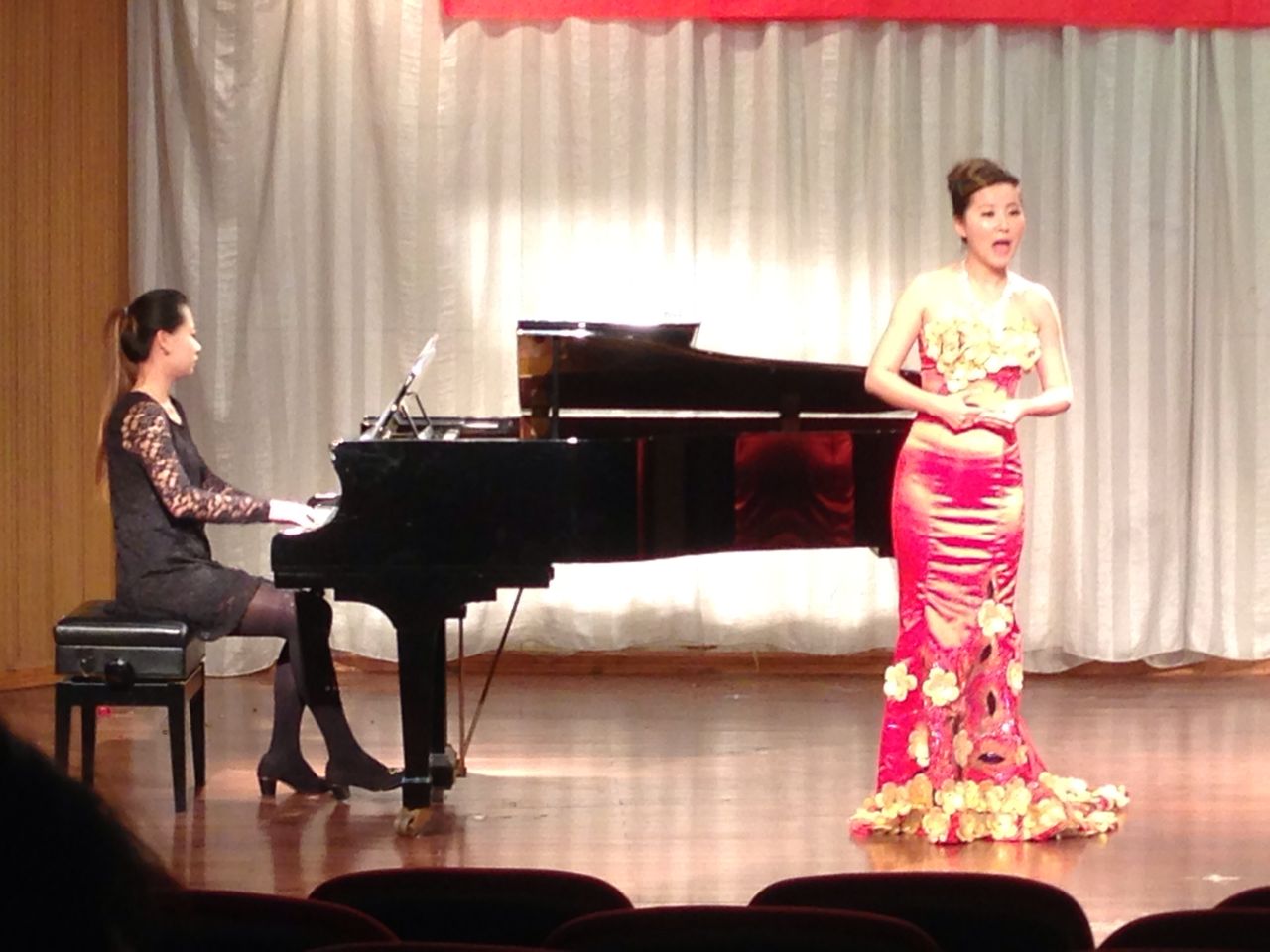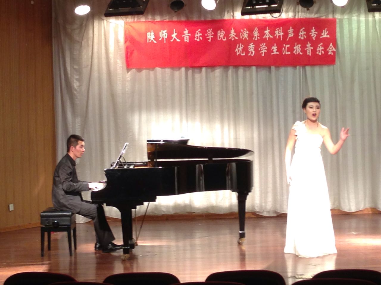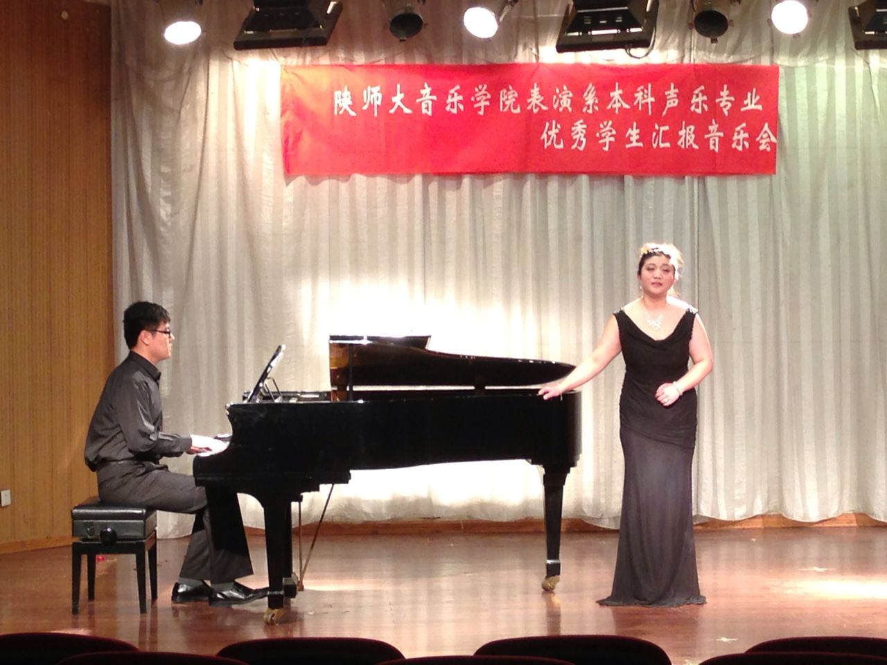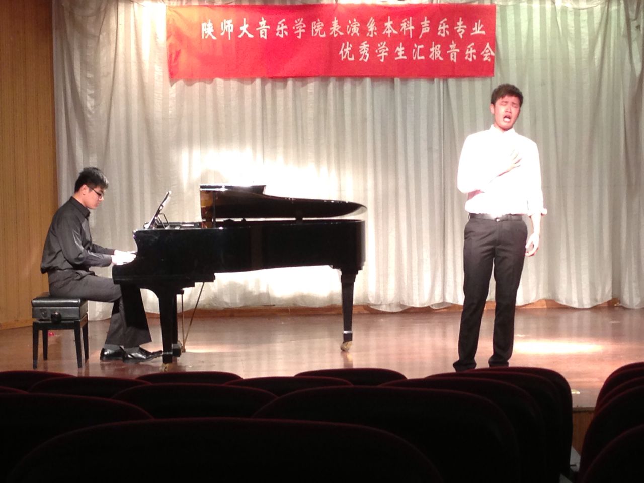 其中2011级范增磊、陈欢、张海蓉、沈娜、2012级赵金梦等同学尤为突出。范增磊对音乐感觉的把握和对作品角色的理解恰如其分,能快速的融入作品角色当中,舞台表现力极为丰富;陈欢同学的演绎和对舞台的驾驭能力日趋成熟,对作品情感的表达和声音技巧的应用游刃有余;张海蓉同学的表演轻松自如,自由大方,不再是那个紧张怯场的小姑娘,完整的表达了作品的内涵,选歌方面与其气质非常相符,让人眼前一亮;沈娜同学对音乐风格的把握愈到位,完全传达了《圣母颂》所表达的虔诚,舞台气质在逐渐提升;赵金梦同学的演唱仿佛让我们走进了真正的大陕北,大气豪爽,很有潜力。
