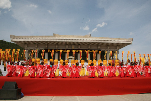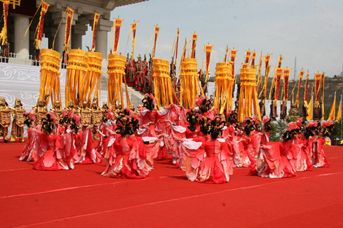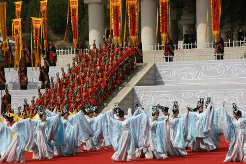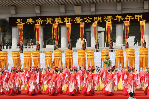 4月5日上午9:50,甲午清明公祭轩辕黄帝典礼在黄陵县桥山黄帝陵祭祀大殿隆重举行,全国政协副主席卢展工,中国国民党副主席林丰正及夫人黄雪,陕西省委书记、省人大常委会主任赵正永,省长娄勤俭,省委、省人大、省政府、省政协、省军区和武警陕西省总队的负责同志,西安市委、市政府,延安市委、市政府,黄陵县委、县政府的主要负责同志,陕西各界守陵儿女代表,以及来自全国各地的群众代表现场见证了这场宏大肃穆的祭祀大典。典礼中乐舞告祭环节主要由新葡京和体育学院的学生组成。