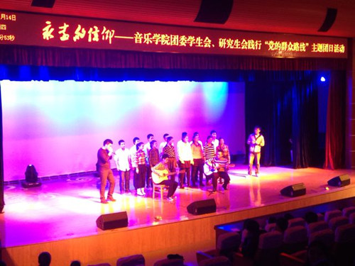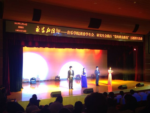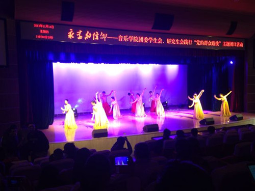 本次活动以演出的形式为大家呈现,节目内容形式多样,丰富多彩。热闹喜庆的开场舞《欢天喜地》营造了欢腾热烈的气氛,让观众们感受到阵阵温暖;诗朗诵《中国梦师大梦我的梦》饱含着师大学子为实现中国梦、师大梦和自己的梦想不懈奋斗的精神;2012级舞蹈2班18位女孩用曼妙的舞姿为带来《颂春》,让大家深深陶醉在改革开放的春天意境之中,流连忘返;歌舞剧《红旗飘扬》将整场晚会推向高潮,中国特色社会主义的伟大旗帜始终在大学生的心中,始终在广阔的大地上高高飘扬;歌伴舞《咱老百姓》两位男同学深情的歌声和舞蹈演员们精彩的伴舞深深表达了同学们对祖国、对党无限的热爱之情。晚会在歌颂中国共产党与人民群众鱼水之情的歌曲《江山》大合唱中圆满落下帷幕。