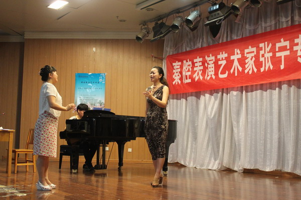 讲座开始,张宁老师首先对陕西戏曲作了简单介绍,并结合自己多年的舞台表演实践对戏曲内涵和人物角色作了简要概述。随后,张宁老师现场演绎碗碗腔《桃园借水》、眉户《梁秋燕》、秦腔《孟姜女》等作品。她的声音清脆圆润、婉转细腻、悦耳动听,舞台表演洒脱大方、生动形象,令现场师生感叹不已。