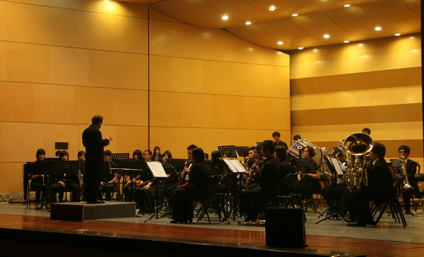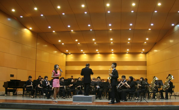 台湾师范大学管乐队是一支训练有素的特殊乐队,其成员来自该校音乐系学生及其他不同院系的爱乐人士,自50年代乐团成立以来,一直致力于音乐的普及和传播,足迹遍及台湾各地及欧美、亚洲地区。此次交流演出,他们带来了不同风格的管乐作品,音乐风格跨越古典与现代,传统与流行。在上半场中,乐队演奏了《“康第德”序曲》、《登峰造极》等西方经典的管乐作品,其中音乐系大四学生罗达钧(黑管)、黄贞纶(短号)分别同乐队协作演奏了《主题与变奏曲》和《威尼斯狂欢节》两首协奏曲,以其娴熟的技巧与精彩的表演赢得了台下观众的热烈掌声。在下半场中,台湾师范大学管乐队为大家演奏了《满山春色》、《望春色》等台湾民谣,以及电影《“侠盗罗宾汉”主题曲》、《新不了情》等电影歌曲和流行歌等。尤其是在演奏《我只在乎你》时,台上乐队与台下观众一起互动演绎歌曲,使本场音乐会进入了高潮。而演出中,乐队指挥叶树涵教授富有魅力的指挥与幽默风趣的话语也引来了台下阵阵欢笑与热烈的掌声,现场气氛十分活跃。演出结束后,在观众们的强烈要求下,乐队又返场演奏了《流水年华》、《掌声响起来》等歌曲……