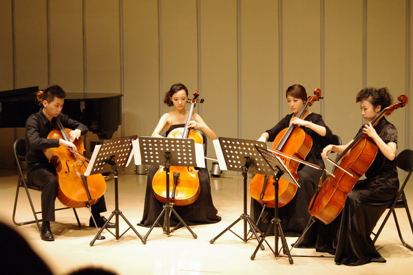 这是一场周末市民音乐会前所未有的、以大提琴为主角的、多元化的重奏音乐会。大提琴声音浑厚、饱满、圆润,音色抒情温暖,被称为“最人性化的声音” ,因此很多人都喜欢这把“感性”的大提琴。大提琴的美妙之处是,它的音域宽广,既可以作为独奏,也可以作为重奏。多把大提琴重奏,是目前在欧美古典乐团比较流行的表演形式,例如闻名遐迩的柏林爱乐12把大提琴乐重奏团。大提琴重奏的前提是,对几把大提琴的个人技术和合奏能力都有很高的要求,演奏者之间的演奏水平也不能太悬殊,因此,这种对演奏者要求很高的音乐会形式在国内比较少见,而在西安的正式公开舞台上更是从来没有出现过。
