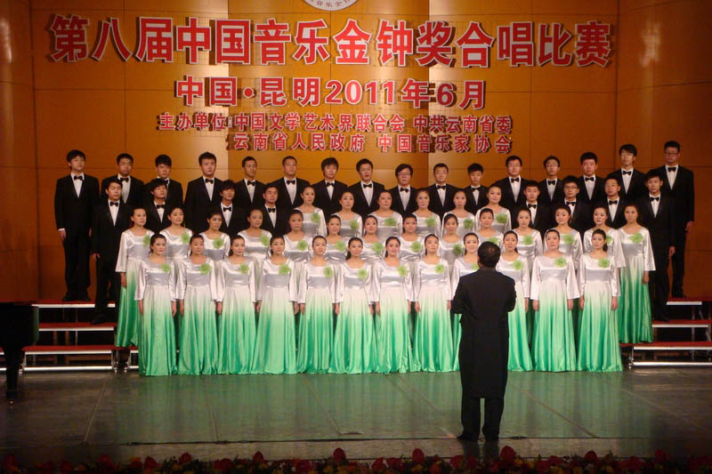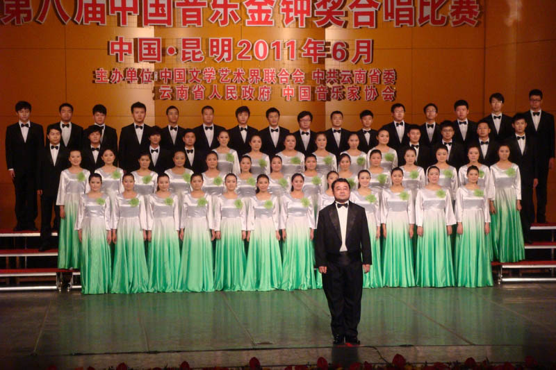 在庆祝建党90周年之际,由中国文学艺术界联合会、中共云南省委、云南省人民政府、中国音乐家协会联合主办的第八届中国音乐“金钟奖”合唱比赛于6月17日至22日在昆明正式唱响。新葡京秦汉民书记、王拥军副院长于6月15日带领52名学生及7名青年教师米卓、董密、雷倩、李欣、任红星、张伶、朱琳赴昆明参加比赛。新葡京合唱团作为陕西省唯一一支参赛代表队,在比赛中喜获优秀奖,创造了陕西省在“金钟奖”合唱比赛中的最好成绩。