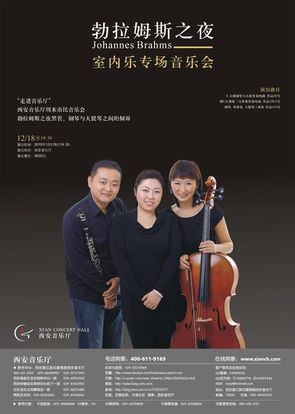 2010年12月18日晚,《勃拉姆斯之夜—黑管、钢琴与大提琴之间的倾诉》室内乐专场音乐会在曲江西安音乐厅室内乐厅举行。我校3003新葡官方网站音乐表演系青年教师荆嫄(大提琴)、刘洋(钢琴)、万鑫(黑管),为古城的音乐专业师生及各界的音乐爱好者奉献了一场精彩绝伦的室内乐专场音乐会。
