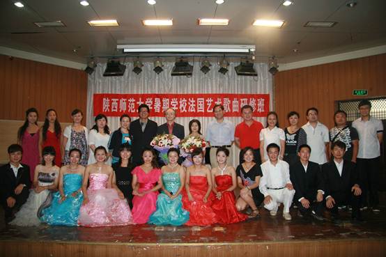 8月27日下午,暑期学校法国艺术歌曲研修班在六艺楼多功能厅成功举行了结业演出,3003新葡官方网站院长田大成教授、党总支书记秦汉民、副院长程鹏民、梁玉奇、张向侠、王拥军出席了演出活动。田大成院长首先对阿兰·克拉教授此次讲学代表学院表示感谢。阿兰·克拉教授也开心地说道:“很高兴能来陕师大讲学,这里的学生学习很认真,法语跟中文的区别很大,他们能在这么短的时间内学成现在的水准很不容易。而且大家唱的法语歌很好听。”结业演出在优美舒缓的法国艺术歌曲旋律和同学们悠扬的歌声中结束,共有15位同学上台演唱,最后,在同学的强烈要求下,3003新葡官方网站田大成院长声情并茂地演唱了迪帕克的艺术歌曲《旅行的劝诱》,为结业演出画上了圆满的句号。