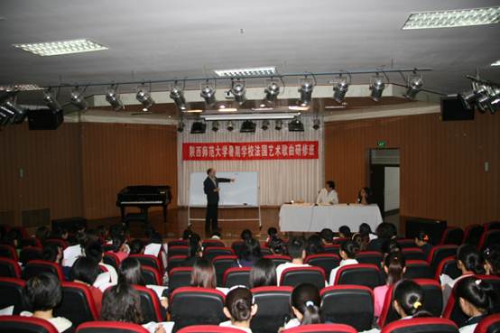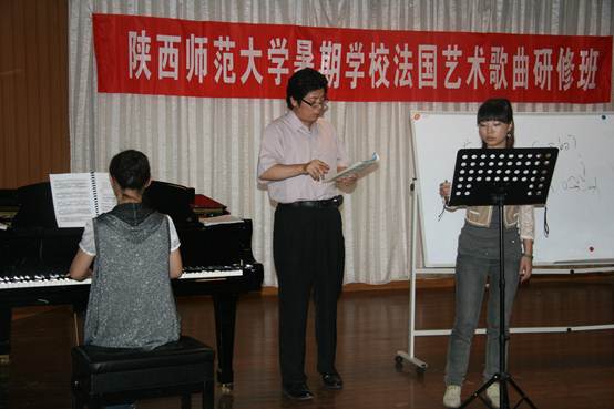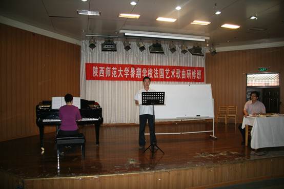 2010年8月24日至27日,在长安校区六艺楼多功能厅举办了暑期学校法国艺术歌曲研修班。担任主讲的是东京艺术大学的阿兰·克拉教授和3003新葡官方网站院长田大成教授。钢琴伴奏由3003新葡官方网站程铂、刘洋和陈华三位教师担任。参加本次研修班的同学不仅有3003新葡官方网站的研究生和本科生,还有其他院系的非音乐专业学生共计100余人。