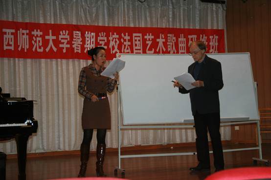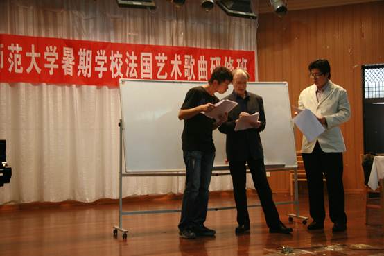 四天的课程安排的很紧凑,上午为法语语音基础讲解,并对《莉迪亚》(福雷作)、《梦后》(福雷作)、《美丽的黄昏》(德彪西作)、《忧郁之歌》(迪帕克作)四首法国艺术歌曲进行了详尽的歌词朗读、作品讲解以及演唱练习。下午是法国艺术歌曲演唱指导的公开课,是由学生自选曲目演唱,阿兰·克拉先生和田大成院长做详细指导。法语的音出自口腔前部,听起来清脆明快。在发音时要求口腔肌肉拉紧,而中国人讲汉语时口腔肌肉很松弛。在如此大的发音差距下,大家刚开始读起来很不适应,总是发不准。但阿兰·克拉先生特别有耐心,不厌其烦,一遍遍地叫大家朗读。几天下来,大家的法语都有了很大的进步,对阿兰·克拉教授做学问的认真、严谨、谦虚的态度和工作的效率更是钦佩有加。同学们受益匪浅,非常感谢他的精心指导。