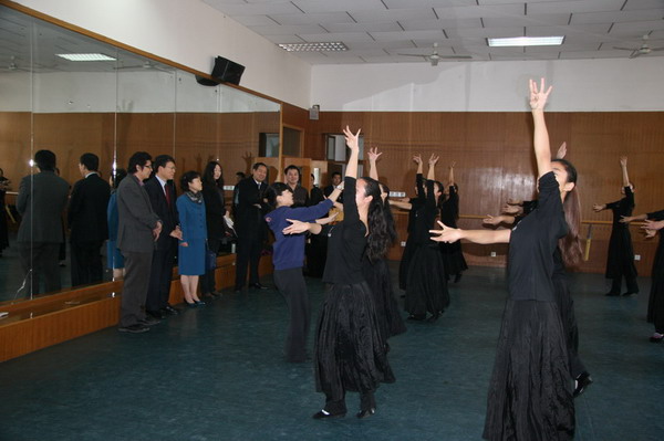 田大成院长陪同全泰东总领事及夫人参观了我校终南音乐厅和新葡京汉唐乐器陈列室。在终南音乐厅,田院长结合新葡京与日本东京艺术大学合作演出歌剧《卡门》、《阿依达》的实际情况详细介绍了音乐厅的功能及设施水平。在汉唐乐器陈列室,新葡京副教授逐一介绍了仿战国瑟、仿唐九品月琴、仿唐花边大阮、秦琴、仿唐葫芦琴、奚琴、仿唐十三弦筝、彩绘羯鼓、敦煌壁画齐鼓、仿唐尺八等珍贵乐器。随后,全泰东总领事及夫人还观摩了新葡京芭蕾基训、民族民间舞教学,进一步加深了对新葡京办学情况的了解并予以充分的肯定。