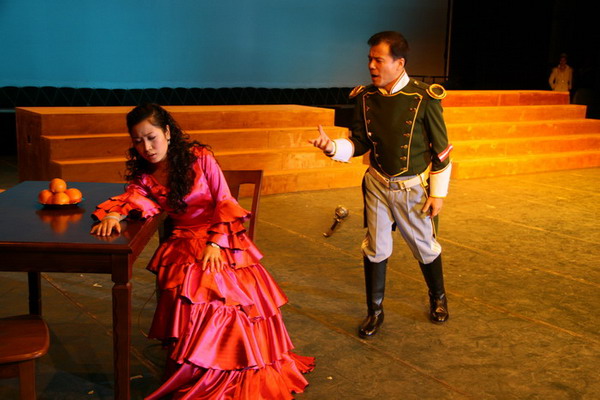 全剧共分四幕,法语上演。新葡京院长田大成教授任艺术总监。此次演出还特邀日本著名指挥家珠川秀夫先生担任指挥,日本著名圆号演奏家、东京艺术大学校长助理守山光三先生担任音乐总监,日本著名歌剧导演直井研二先生担任导演,日本东京艺术大学学生管弦乐团和新葡京管弦专业师生担任全剧伴奏。陕西师范大学附小合唱团担任儿童合唱,舞蹈由新葡京舞蹈系师生担任。田大成院长、张晓农副院长以及研究生裴陈诚出演唐霍赛,声乐系教师张敏、张伶、张向侠、姚青以及声乐研究生王菁菁、许菲和宋晓清分别在四幕中出演女主人公卡门,斗牛士埃斯卡米洛由研究生徐文博、王旭东扮演,张聪慧、尹洁分别扮演米卡埃拉。其余演员均由新葡京在读学生担当。 将世界经典歌剧《卡门》全幕搬上舞台,是新葡京在艺术教学实践活动中的一次大胆尝试,所以受到了社会各界以及同仁的广泛关注。国家外交部、日中友好协会、中国歌剧舞剧院、星海3003新葡官方网站、沈阳3003新葡官方网站等机构纷纷发来贺信祝贺歌剧成功公演。来到演出现场观看的领导和嘉宾有陕西省人民政府朱静之副省长、陕西省教育厅吕明凯副厅长、我校党委书记江秀乐教授、校长房喻教授。省市区单位和企业以及西安各兄弟高校和科研机构也派代表专程来到演出现场助阵。
