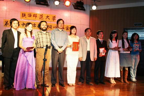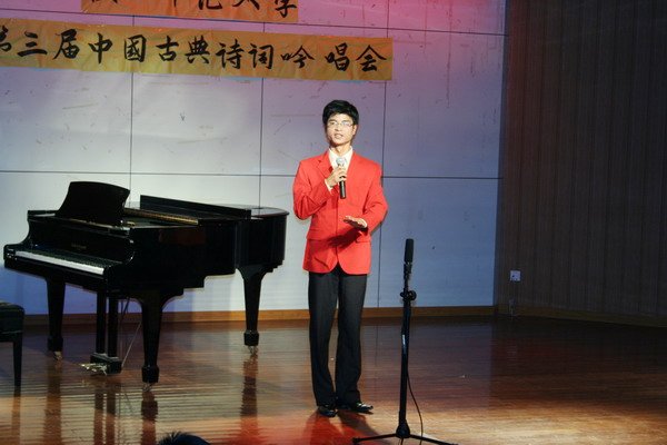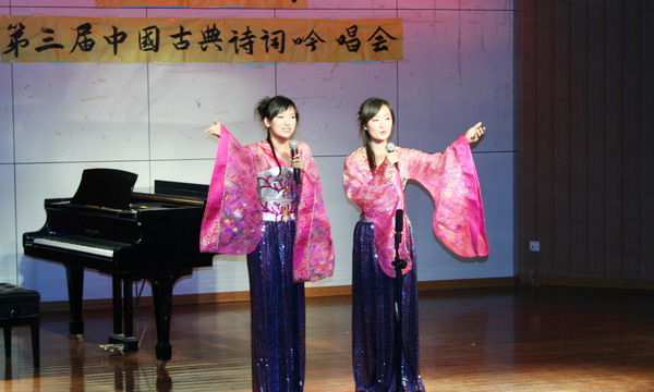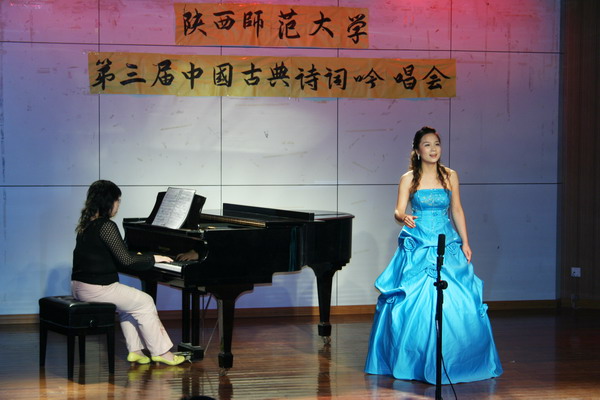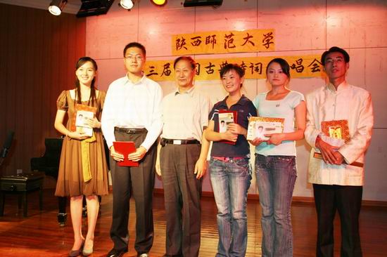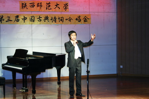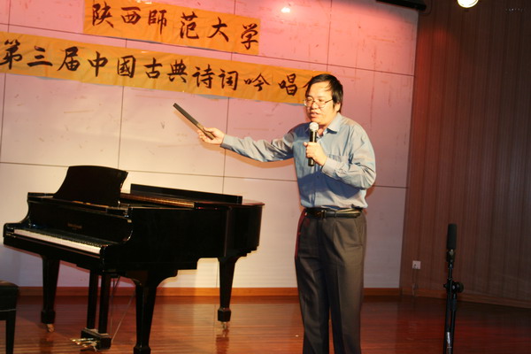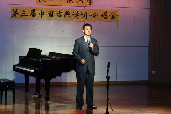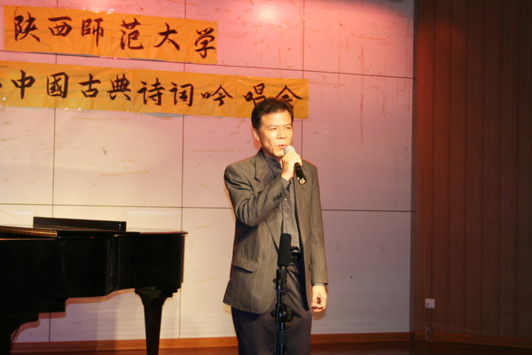 本届吟唱会是我校为参加以“构建和谐语言生活,弘扬中华优秀文化”为主题的第十届全国推广普通话宣传周而举办的活动之一,旨在传播民族文化、弘扬优秀传统、普及高雅艺术、培育一代新人。吟唱会节目题材多样、内容丰富,既有诗经乐府、又有唐诗宋词。表现形式也多种多样,既有筝歌琴曲、又有吟诵调、咏唱。在一阵清悦纯正的音乐伴奏下,《长相思》拉开了吟唱会的序幕。吉沁同学朗诵《雨霖铃》,低沉忧伤,把伤感离别之情表现得淋漓尽致。随着音乐的节拍和各位学子的吟诵,古典诗词的无限魅力使观众们陶醉其间,品味一个个传统文化的美餐。吟唱会最后,几位嘉宾老师的即兴吟唱,把吟唱会推向了又一个高潮。新葡京常务副院长张晓农教授吟唱的《山坡羊·骊山怀古》和《清江曲》,激扬悲壮。陕西师范大学原副校长吕九如教授的东坡词“人有悲欢离合,月有阴晴圆缺,此事古难全”,“但愿人长久,千里共婵娟”,豪放洒脱,浪漫而忧伤的意境从他那饱含深情、抑扬顿挫的朗诵中自然地流淌出来。教务处处长党怀兴教授倾情吟诵的《大江东去》,壮怀激烈,让人不由发思古之幽情。中国古典诗词宝库中的艺术精品在美妙音乐的伴奏下,经过吟唱者的真情演绎重放出璀璨的光芒。