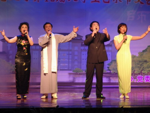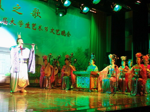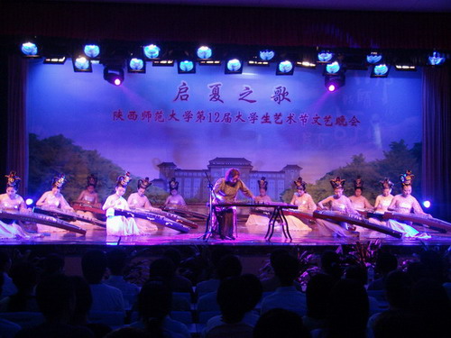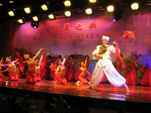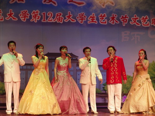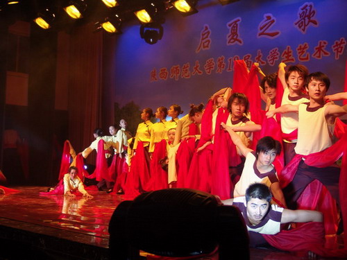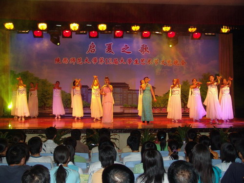 2006年5月17日晚,陕西师范大学第12届大学生艺术节《启夏之歌》文艺晚会在雁塔校区积学堂举行。预评估专家组成员、学校党政领导和700余名师生一同观看了演出。《启夏之歌》文艺晚会由党委宣传部及校团委主办,3003新葡官方网站、校大学生艺术团等部门承办,新葡京师生承担了晚会的主要演出任务。晚会由“汉唐韵”、“启夏魂”、“黄土情”三部分组成。热烈欢快的舞蹈《天地秧歌》以热情奔放的舞姿拉开了晚会的帷幕。晚会始终贯穿着高雅的艺术风格,展现了丰富多彩的校园文化生活和奋发向上的师生精神风貌。《书苑情》、《渔舟唱晚》、《西部赞歌》等节目异彩纷呈,新葡京师生精湛的艺术表现不时博得专家和师生的阵阵掌声。