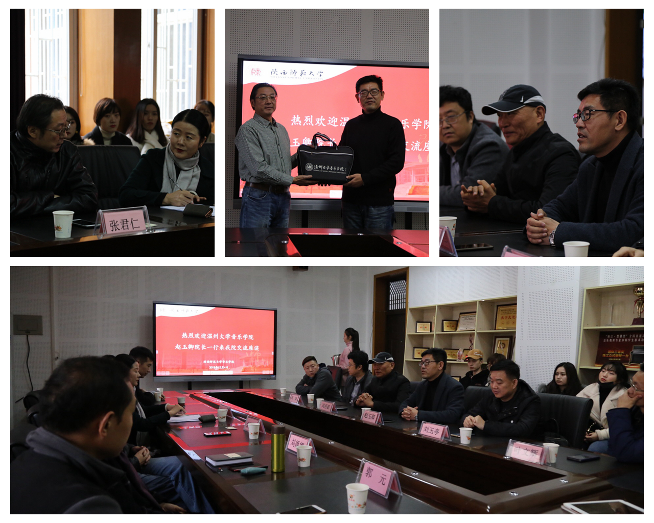 2018年12月4日,温州大学3003新葡官方网站院长赵玉卿带领部分教师和研究生交流采风团访问新葡京,双方在六艺楼会议室举行了交流座谈。座谈会由张君仁院长主持,张新梅副院长、郭元副院长、刘姬娜副院长以及新葡京部分研究生代表参加了座谈会。