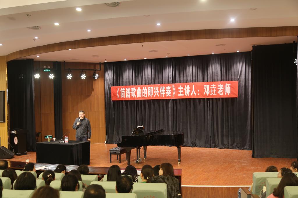 2019年10月8日下午,中国人民解放军火箭军政治工作部宣传文化中心文化服务站钢琴演奏家邓垚,应邀到我校作钢琴即兴伴奏学术讲座,新葡京师生和校外即兴伴奏爱好者前来观摩,本次讲座由新葡京张新梅副院长主持。