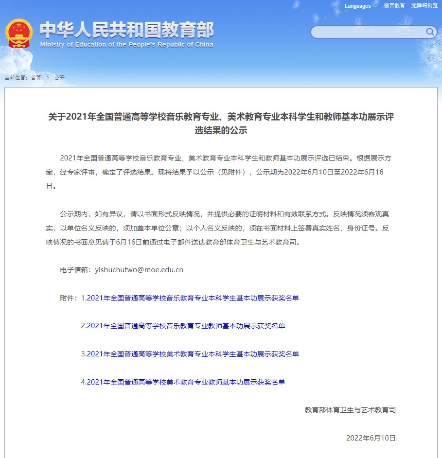 附:关于2021年全国普通高等学校音乐教育专业、美术教育专业本科学生和教师基本功展示评选结果的公示 - 中华人民共和国教育部政府门户网站http://www.moe.gov.cn/jyb_xxgk/s5743/s5745/A17/202206/t20220610_636343.html