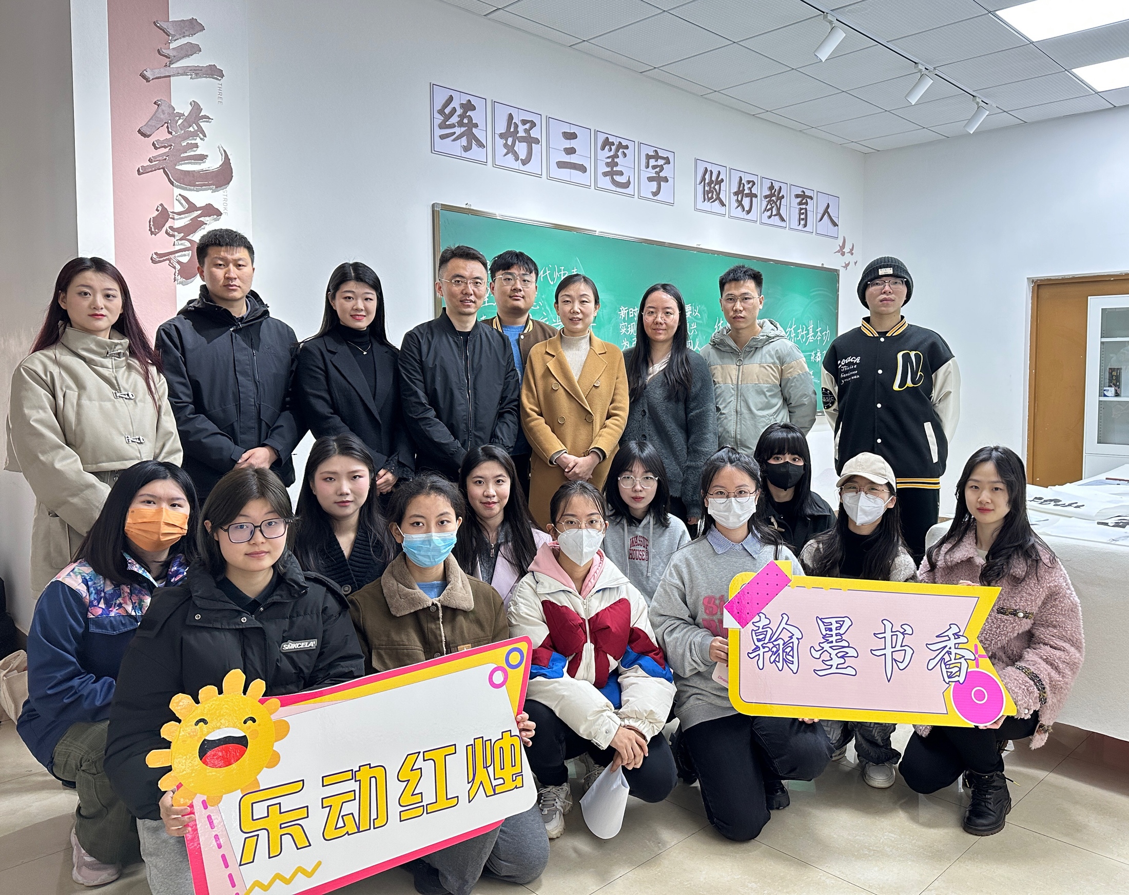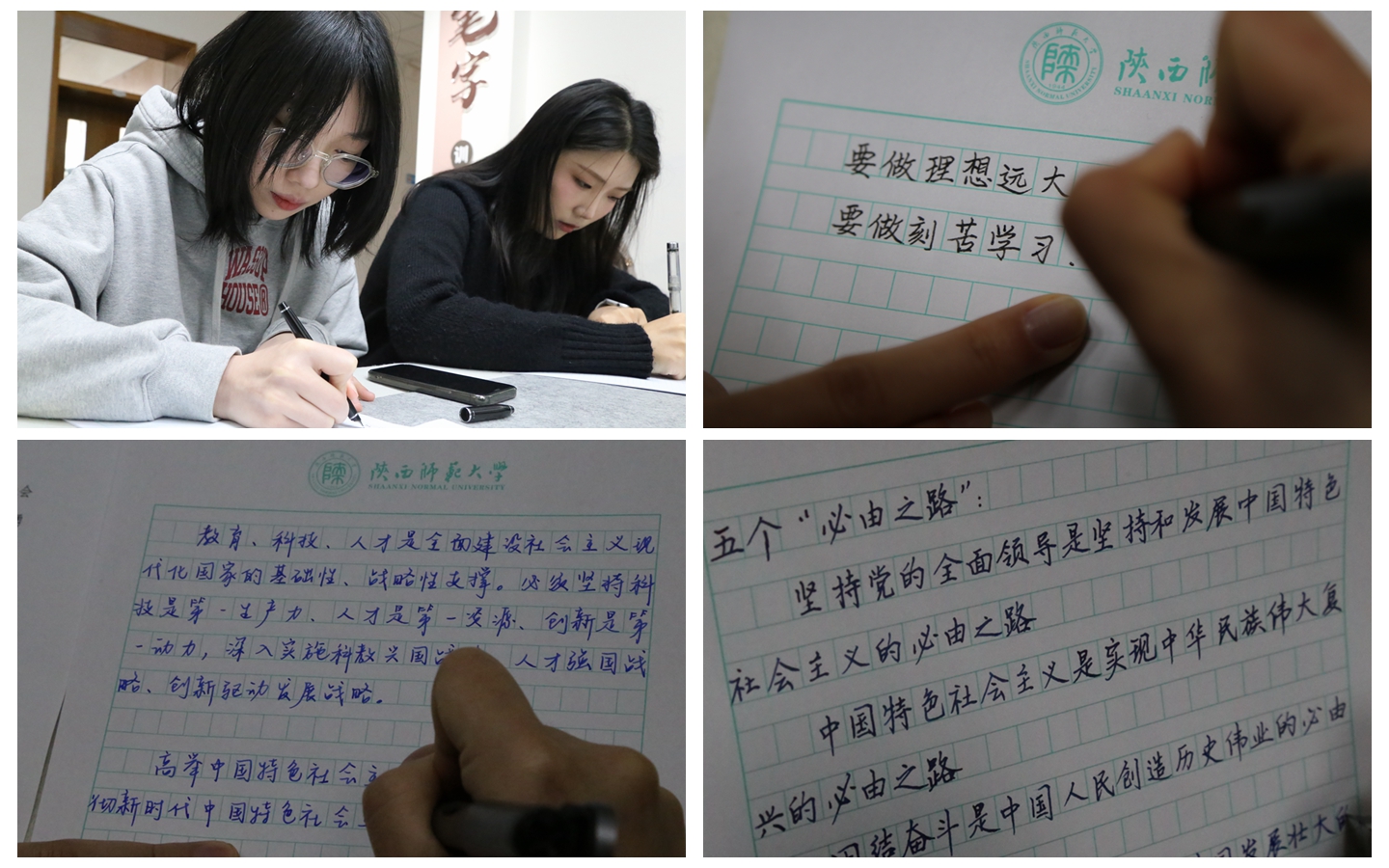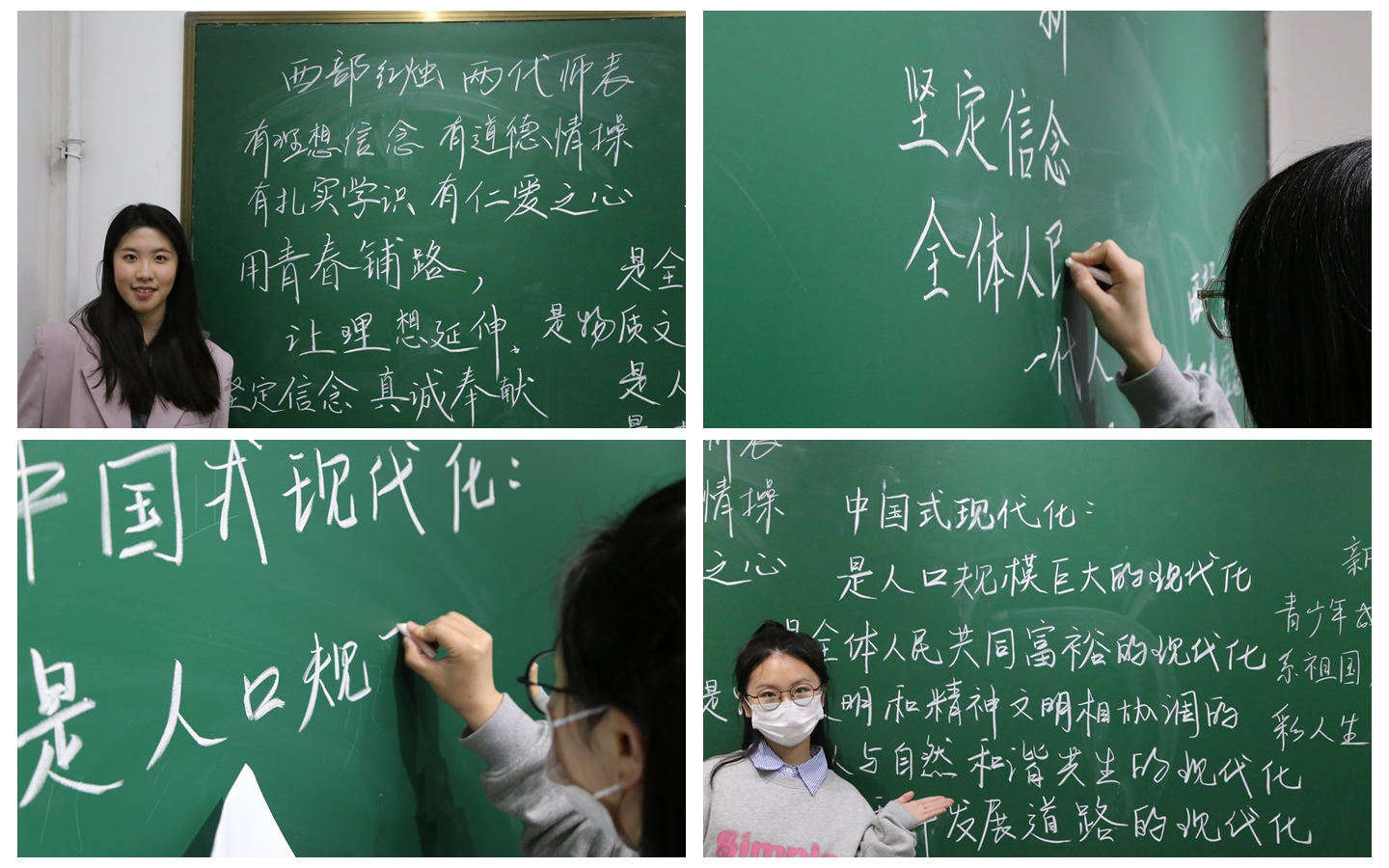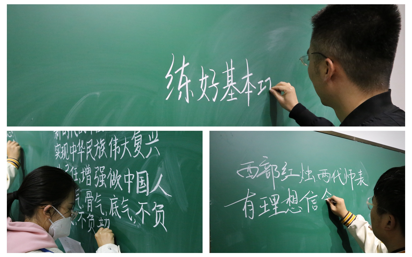 随后,师生共同完成了毛笔字、钢笔字和粉笔字书写。仝昊用秦隶书写了“见贤思齐”“敬事”与大家共勉,同时向在场师生介绍了从秦篆到秦隶的演变。写毛笔字的同学或行云流水,或入木三分;写粉笔字和钢笔字的同学通过誊写党的二十大报告原文、习近平总书记对青年的寄语以及关于教育的重要论述,在练字的同时,学习贯彻党的创新理论,增强“四个意识”、坚定“四个自信”、做到“两个维护”。