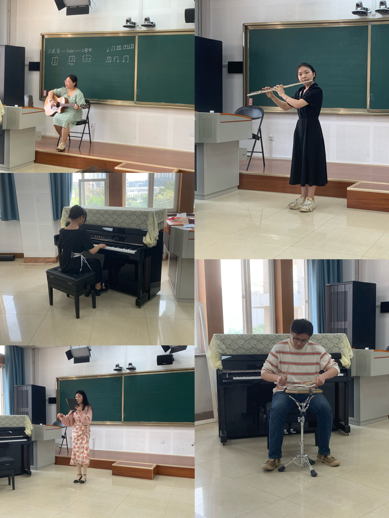 首先,由音乐学(音乐教育、音乐理论)专业的同学按顺序进行自我介绍、才艺、讲课环节的展示,各位评委根据同学们展示的内容再进行点评。其中,评委们充分肯定了音乐学(音乐教育、音乐理论)专业学生所掌握与展现的各项技能,如,架子鼓、舞蹈、吉他、视唱等。