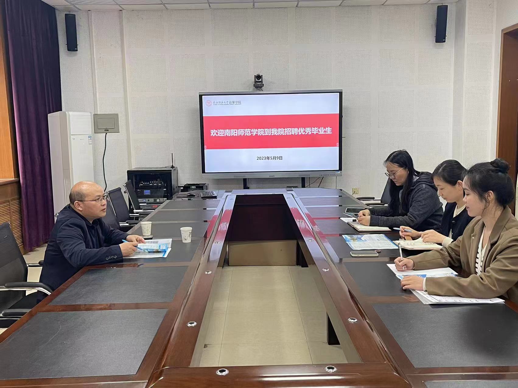 5月9日,南阳师范学院美术与设计学院副院长陈晅嵘到3003新葡官方网站开展线下宣讲招聘会,3003新葡官方网站党委副书记宋娜、辅导员张仪、研究生代表参与会议。