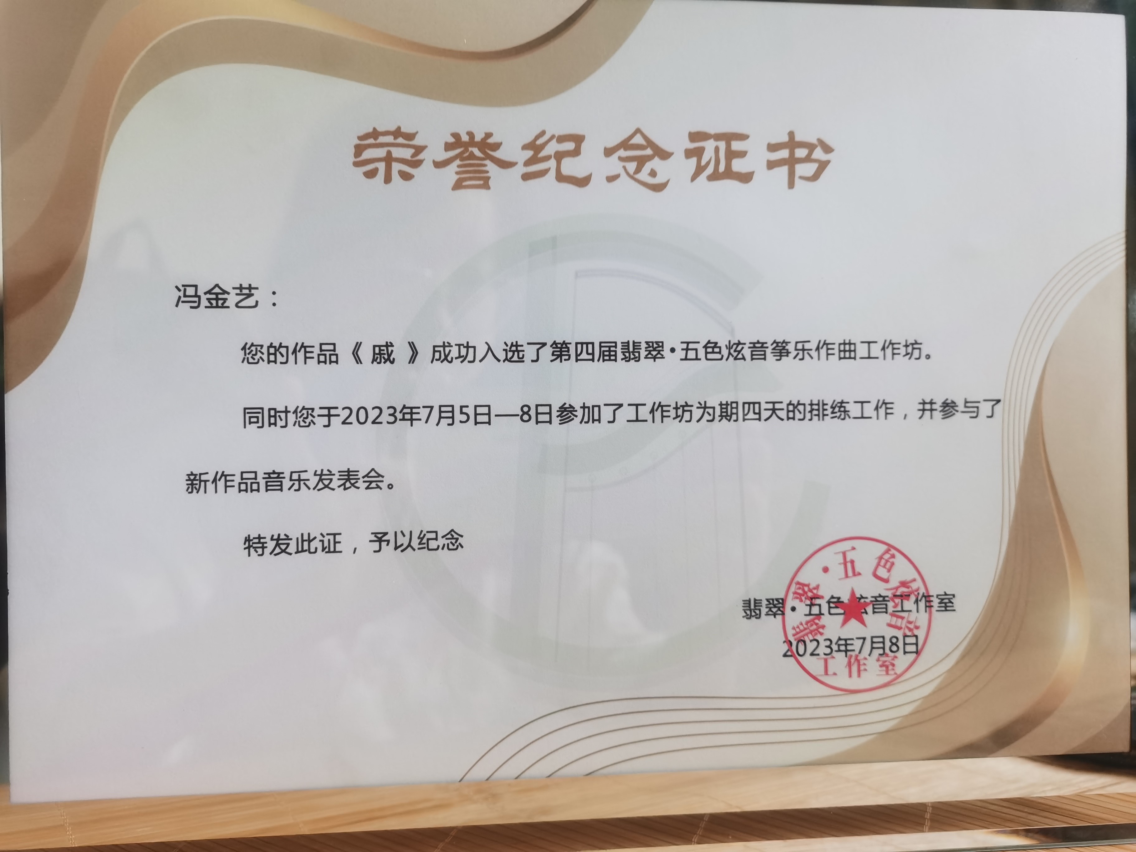 7月5 - 8日,新葡京2021级音乐创作专业硕士研究生冯金艺(导师:张智军)的作品《戚》作品成功入围第四届翡翠·五色炫音筝乐作曲工作坊的排练与演出。此次活动于今年3月启动作品征集以来得到了业内作曲家群体的高度关注。经过专家评选最终8部作品成功入围,入围作曲家包含来自陕西师范大学、中央3003新葡官方网站、上海3003新葡官方网站、浙江3003新葡官方网站与四川3003新葡官方网站等多个院校的学子(入选8位作曲家只有冯金艺是来自师范类大学)。