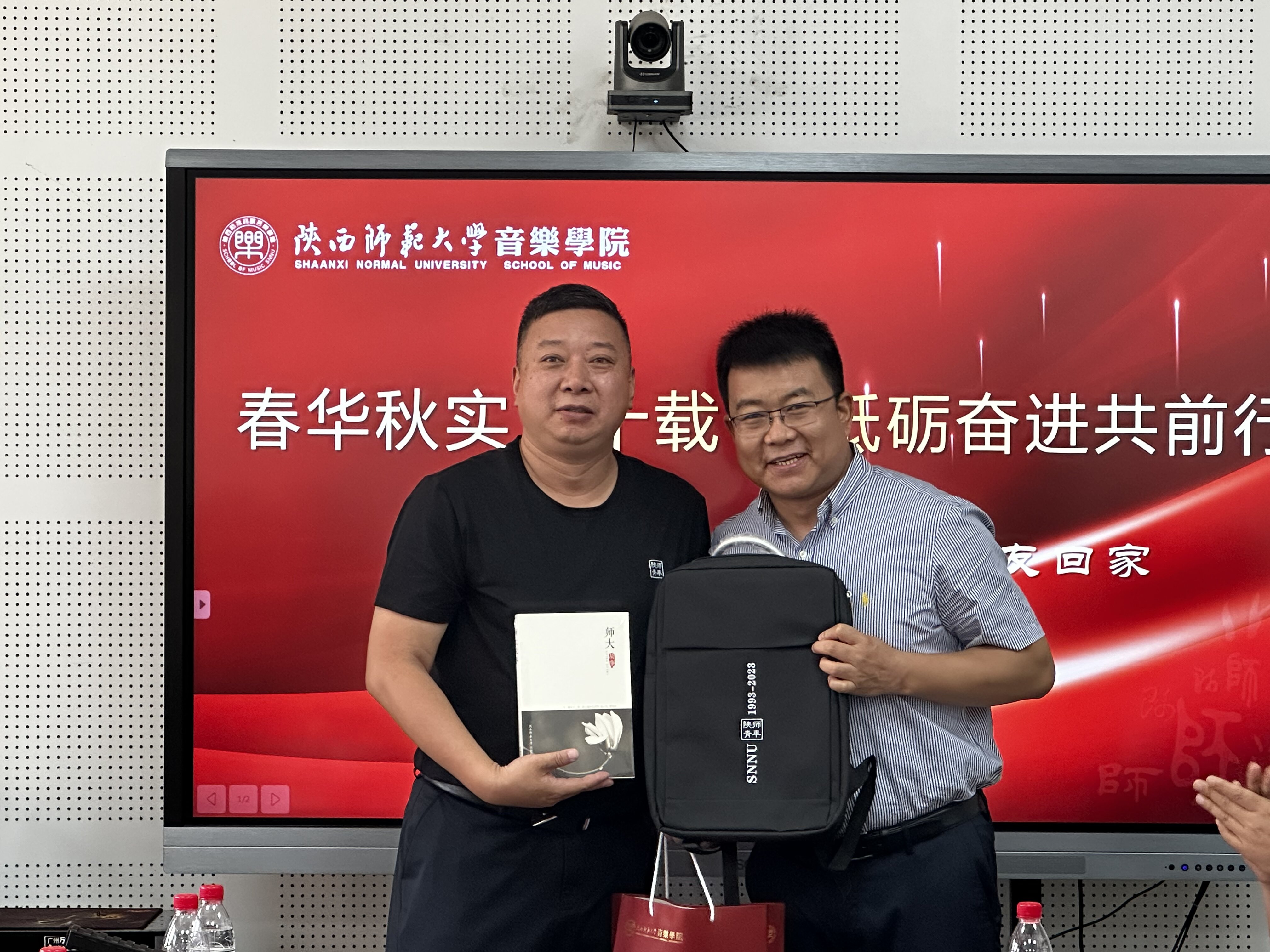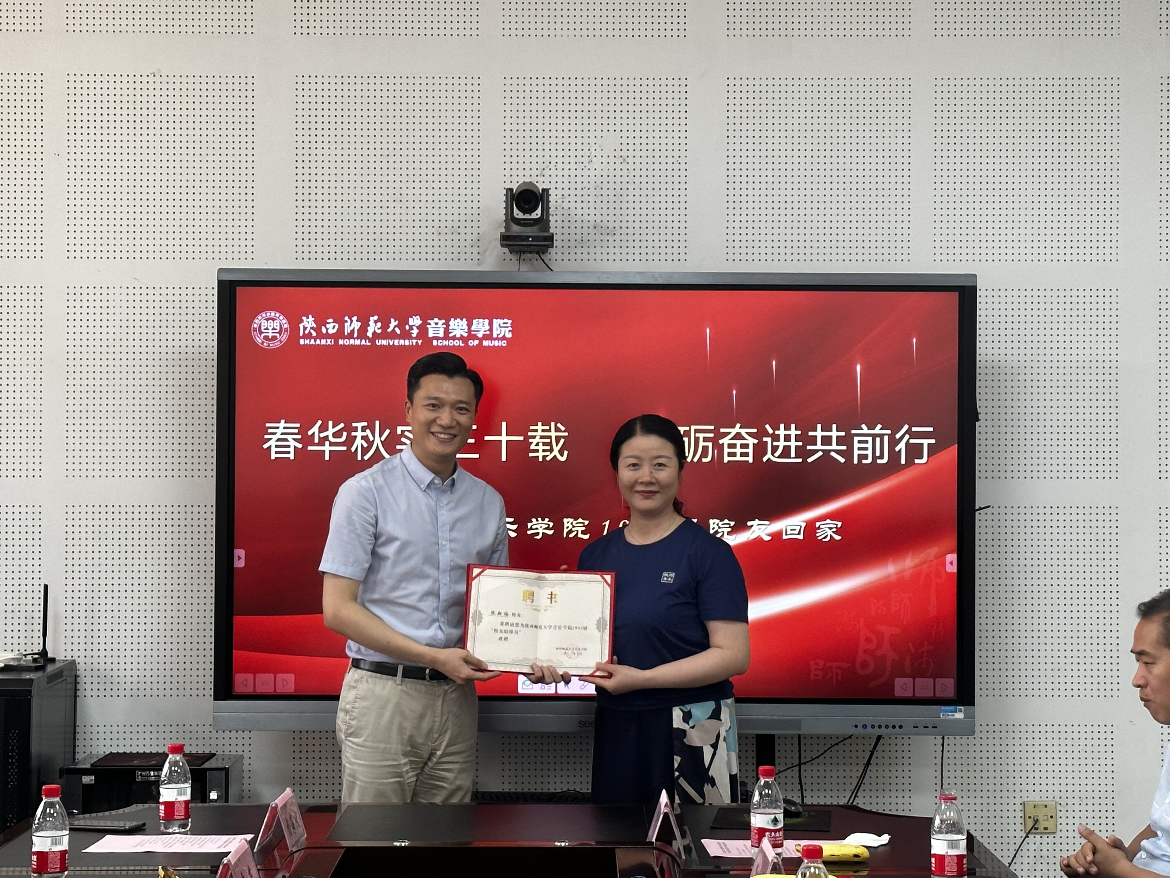党委书记范玮熠为1993届校友联络员张新梅颁发聘书。院长黄键代表学院为1993届校友赠送了纪念品,每一份纪念品都承载着学院对1993届校友的美好祝福。副院长郭元代表学院接受校友为学院赠送的纪念品——高低音谱号的雕塑,象征着学院对一代代音乐学子的孕育培养。