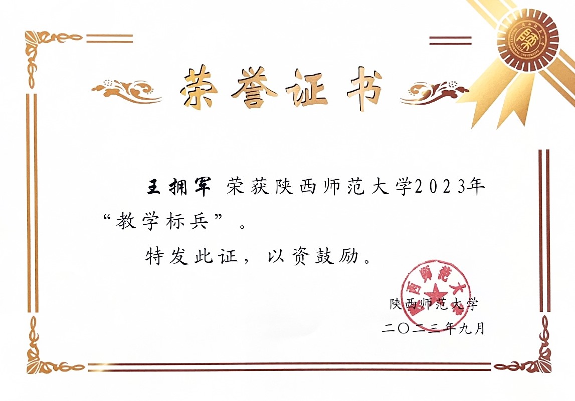 在个人申报、学院推荐、学校审核的基础上,全校共有8位教师的教学工作量及教学获奖情况符合评选要求,学校授予其“教学标兵”荣誉称号。近年来,王拥军副教授先后获得两次校级教学质量优秀奖,一次获得陕西省教学成果奖二等奖。