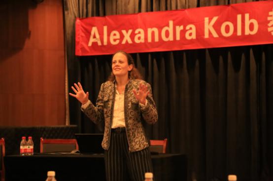 上午Alexandra Kolb教授的理论课程在六艺楼报告厅进行,由郑亚萌老师主持,讲座的题目为:“现代舞蹈教学中的挑战”从舞蹈技巧、舞蹈教育性到后现代舞蹈实验展开交流。