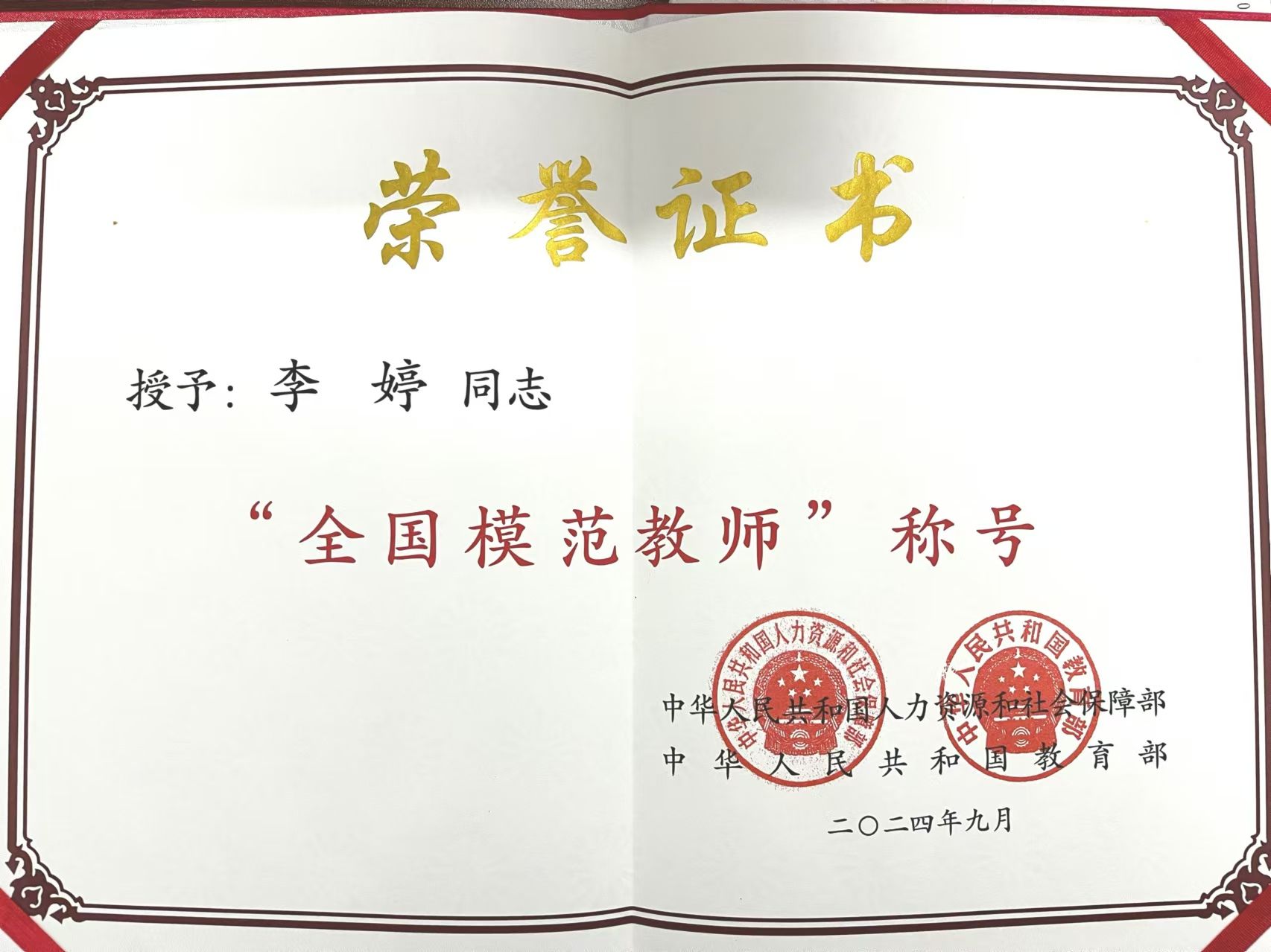 李婷,毕业后扎根基础教育,现任职于西安市未央区教师进修学校。2023年2月被确定为教育部新时代中小学名师培养对象,今年9月,被授予“全国模范教师”称号。