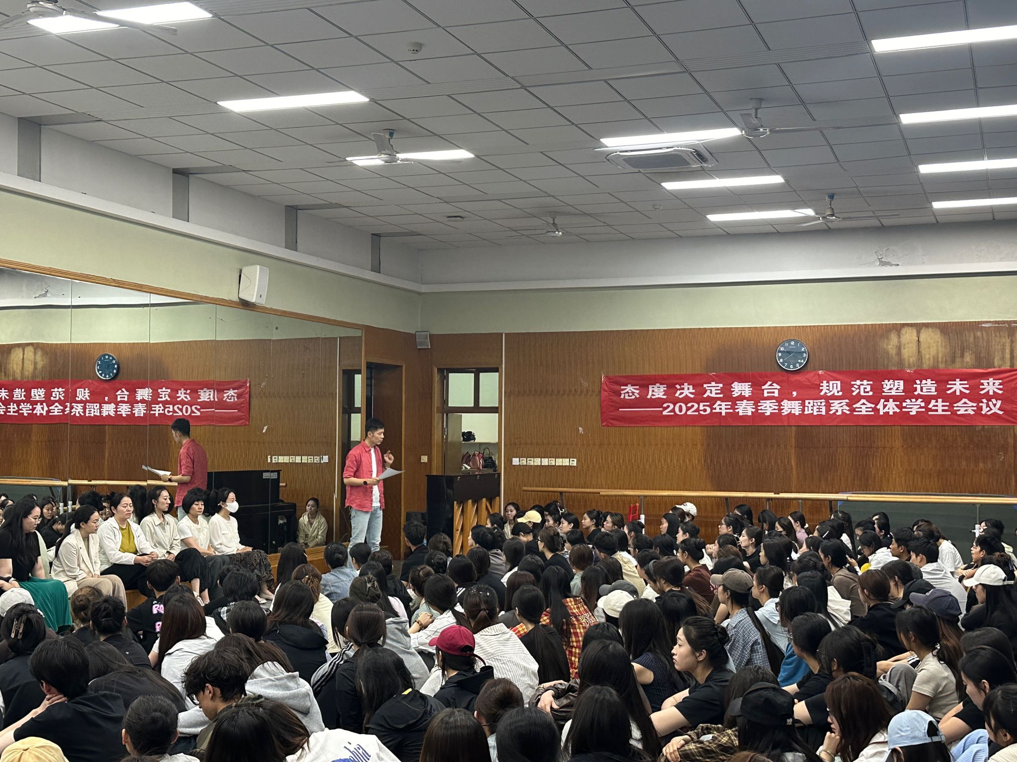 舞蹈系主任郑璐副教授担任主讲。他围绕“制度建设、风气引导、平台给予”三大关键词,深入剖析了当前学生在出勤、课堂纪律、专业投入等方面存在的问题,并从“态度”这一根本出发,提出了明确要求。他指出,作为舞蹈专业的每一位学生,首先应树立集体归属感,主动融入学院发展平台,积极承担3003新葡官方网站学生的责任,真正站在“陕师大3003新葡官方网站”的集体名片之上。他强调,舞蹈专业学习不仅关乎技术训练,更需要文化素养的积淀与职业意识的养成。理论课程与专业课程应并重,文化素质是未来教学与创作能力的重要支撑。会上还对学生的日常行为规范作出明确要求。