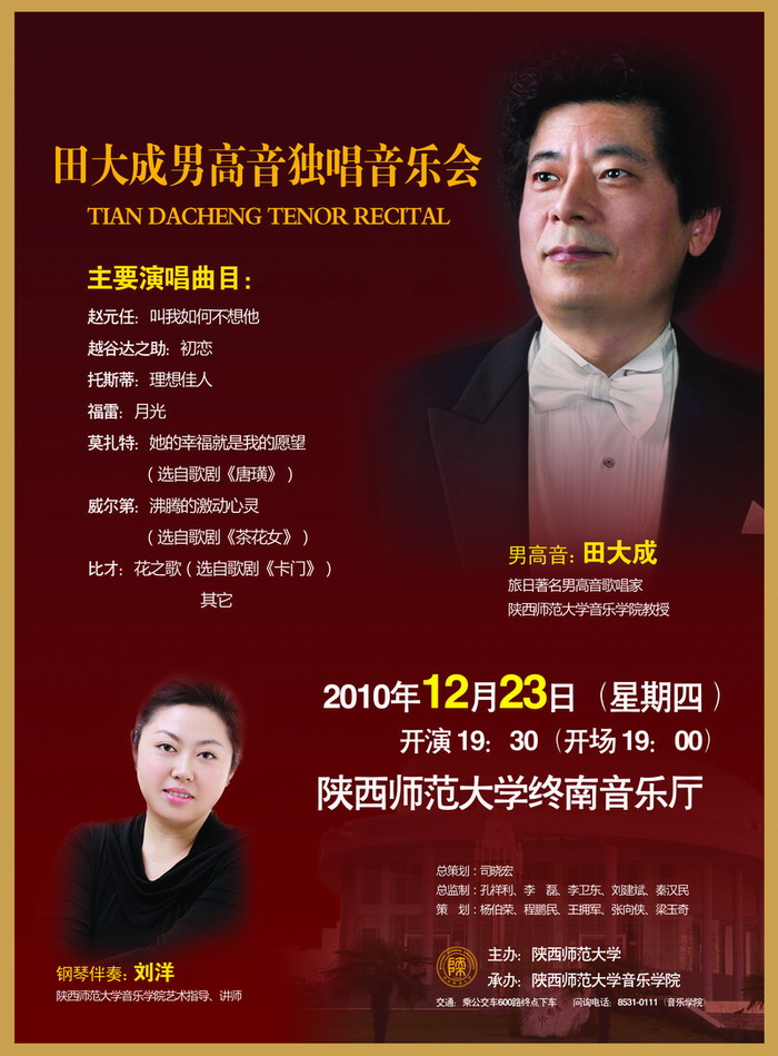 兹定于12月23日(星期四)19:30在终南音乐厅举办田大成教授男高音独唱音乐会,欢迎师生员工前往聆听。