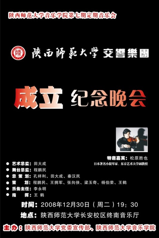 兹定于2008年12月30日晚7:30举办“陕西师范大学交响乐团成立纪念晚会”,敬请我校师生光临观看。