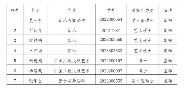 根据《关于做好2024年研究生国家奖学金评选工作的通知》、《关于做好2024年研究生国家奖学金评选工作的补充通知》、《陕西师范大学研究生国家奖学金评选办法》、《音乐学院2024年研究生国家奖学金评选细则》相关要求,经学生申请、资格审查、评选委员会评议,拟推荐吴一帆等4名研究生获国家奖学金,拟推荐张晓楠等3名研究生参与学校差额评选。现将名单公示如下: