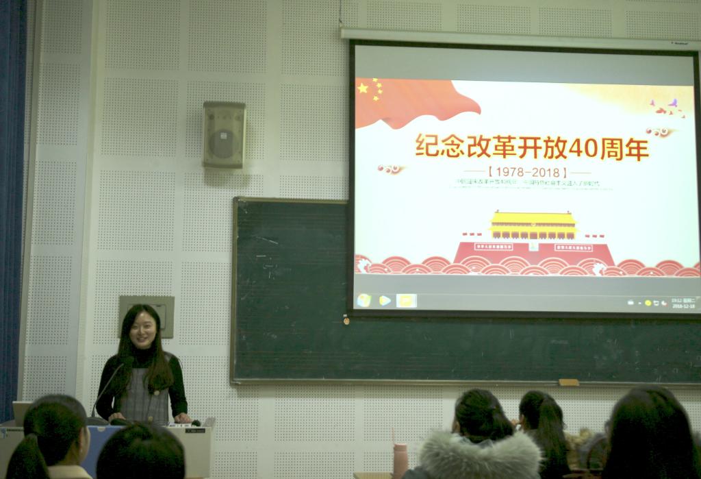 会议由第三党支部书记洪艺华主持并宣布开始。她首先对同学们以各种形式收听收看大会实况的情况作出总结,随后,带领大家再次回顾了习近平总书记在会议上的重要讲话。为了使大家更加深入了解“改革开放”,洪艺华通过PPT播放等形式为大家简要介绍了改革开放的历程、改革开放大事件以及改革开放对我们的重大意义。之后,各位党员发表了自己观看大会后的心得体会,并作交流。