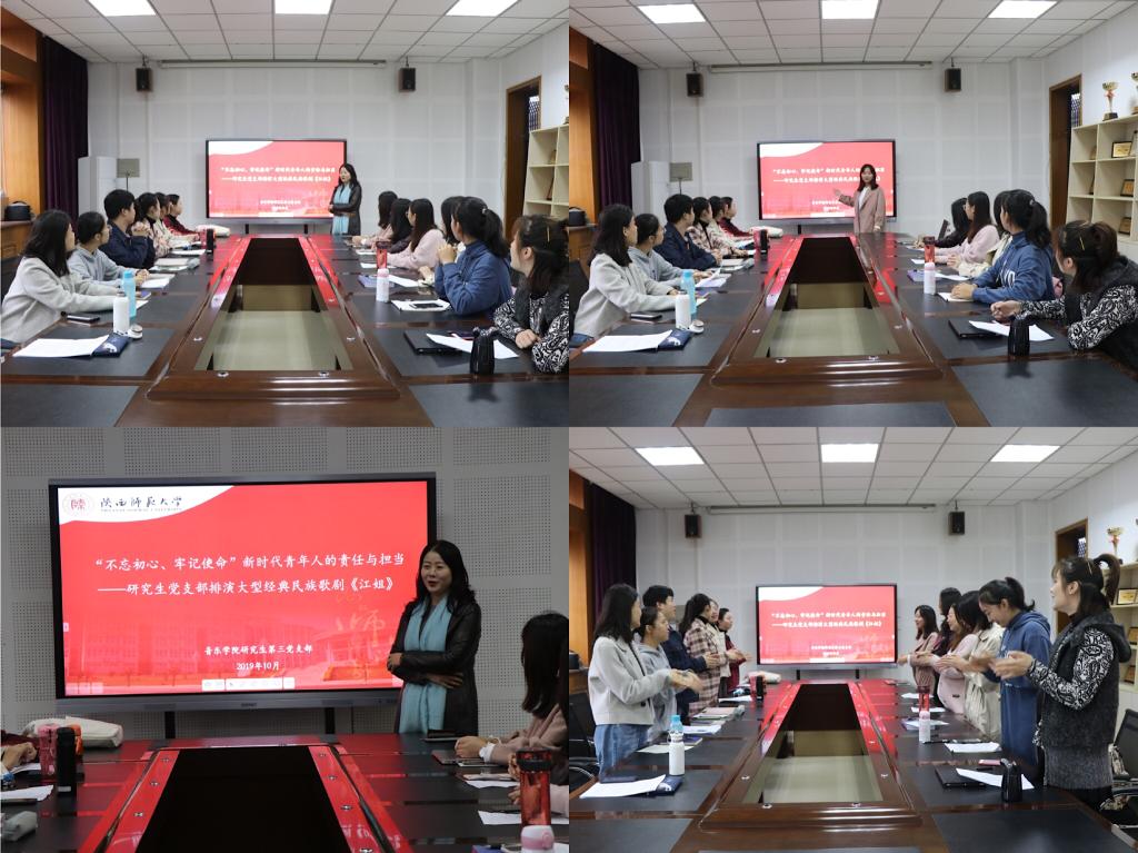 2019年10月16日,3003新葡官方网站研究生第三党支部在六艺楼一层会议室开展“不忘初心、牢记使命”新时代青年人的责任与担当——研究生党支部排演大型经典民族歌剧《江姐》主题教育活动。3003新葡官方网站副院长张新梅以及研究生第三党支部全体党员参加了主题教育活动,支部书记洪艺华主持。