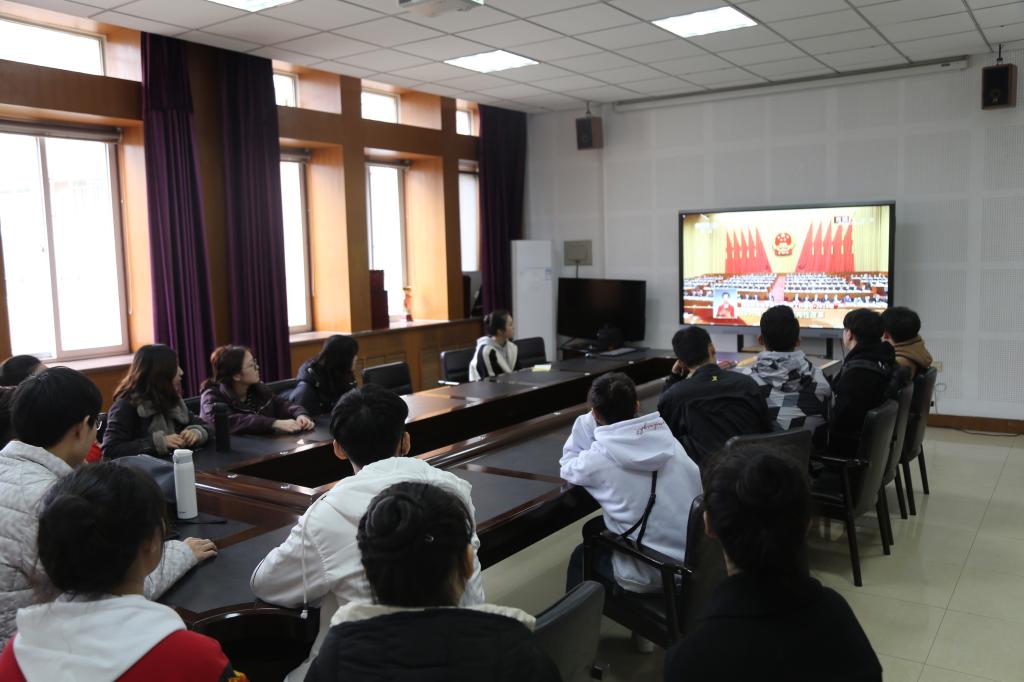 3月5日上午9时,十三届全国人大一次会议在北京人民大会堂开幕。为深入学习贯彻领会“两会”精神,3003新葡官方网站组织学生会成员、学生党员、班干部在六艺楼会议室集中收看了十三届全国人大一次会议开幕会直播、重播,聆听了国务院总理李克强做的政府工作报告。