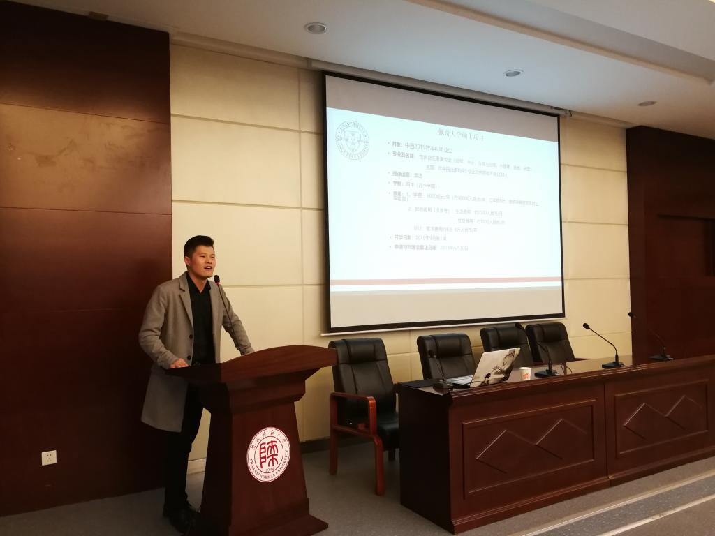 会前,张思凡向招生单位详细介绍了2019届毕业生的专业方向,并对学院各专业的培养计划和目标进行了说明。会上,向保全从地理位置、历史人文、经济环境、校情校史、文化特色、师资力量、机构设置和办学水平等方面,多方位多角度地为学生们进行了讲解和介绍。周强从招生对象、专业类别、录取名额以及学位、学制、就读成本、发展前景等方面展示了佩奇大学的优越学习条件,并就申请要求及流程等相关问题做了进一步的解释。魏婷婷对细节性问题也进行了补充说明。
