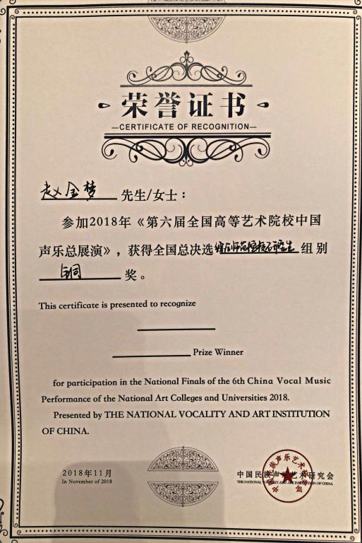 11月3日,第六届全国高等艺术院校中国声乐展演总决赛在宁波落下帷幕,新葡京2016级研究生赵金梦以西北赛区金奖(第一名)进入总决赛,经过两日激烈角逐,荣获全国总决选综合师范院校研究生组铜奖,指导教师李欣副教授,获西北选区优秀指导奖。