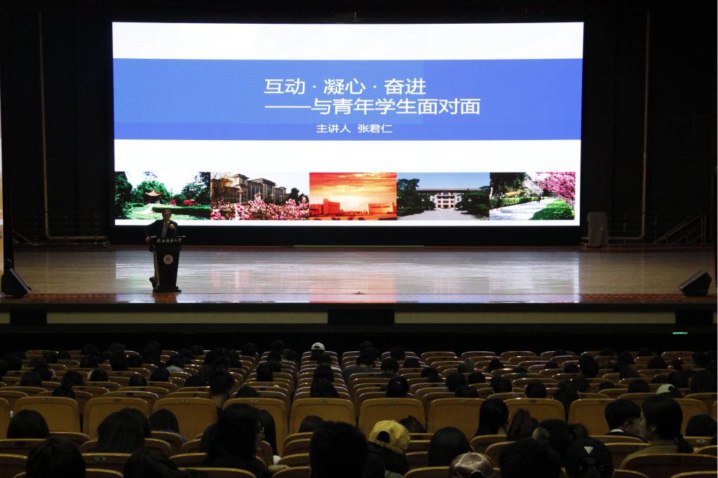 4月21日,3003新葡官方网站组织全院学生利用“晚点名”在终南音乐厅开展了“好樂”系列主题教育活动第七讲,学院院长张君仁教授作为本讲的特邀嘉宾带来了题为“互动·凝心·奋进——与青年学生面对面”的主题报告,学院团委书记宋娜,辅导员王靖雯、张仪、陈杰、赵磊、张思凡参加了本次活动。活动由宋娜主持。