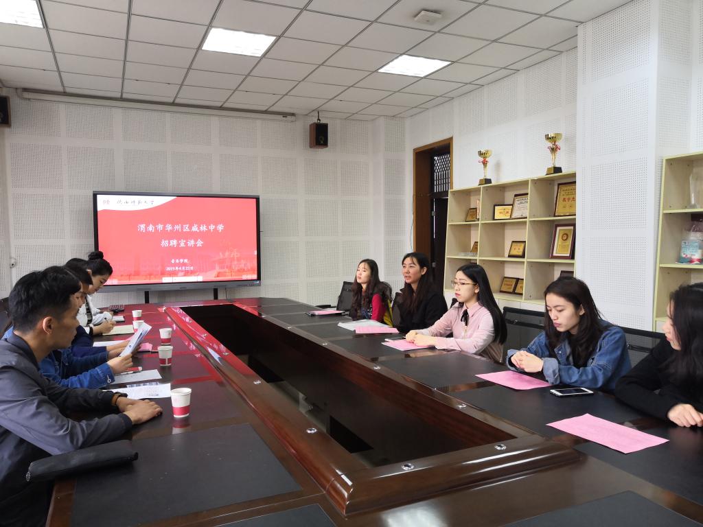 4月22日上午,渭南市华州区咸林中学副校长雷静、安全保卫中心主任徐耀峰、体育艺术中心主任冀林兴来3003新葡官方网站开展了毕业生招聘工作,并在学院一层会议室进召开了宣讲会,学院研究生辅导员王靖雯、本科生辅导员张思凡以及有意向的毕业生参加了本次宣讲会。会议由张思凡主持。