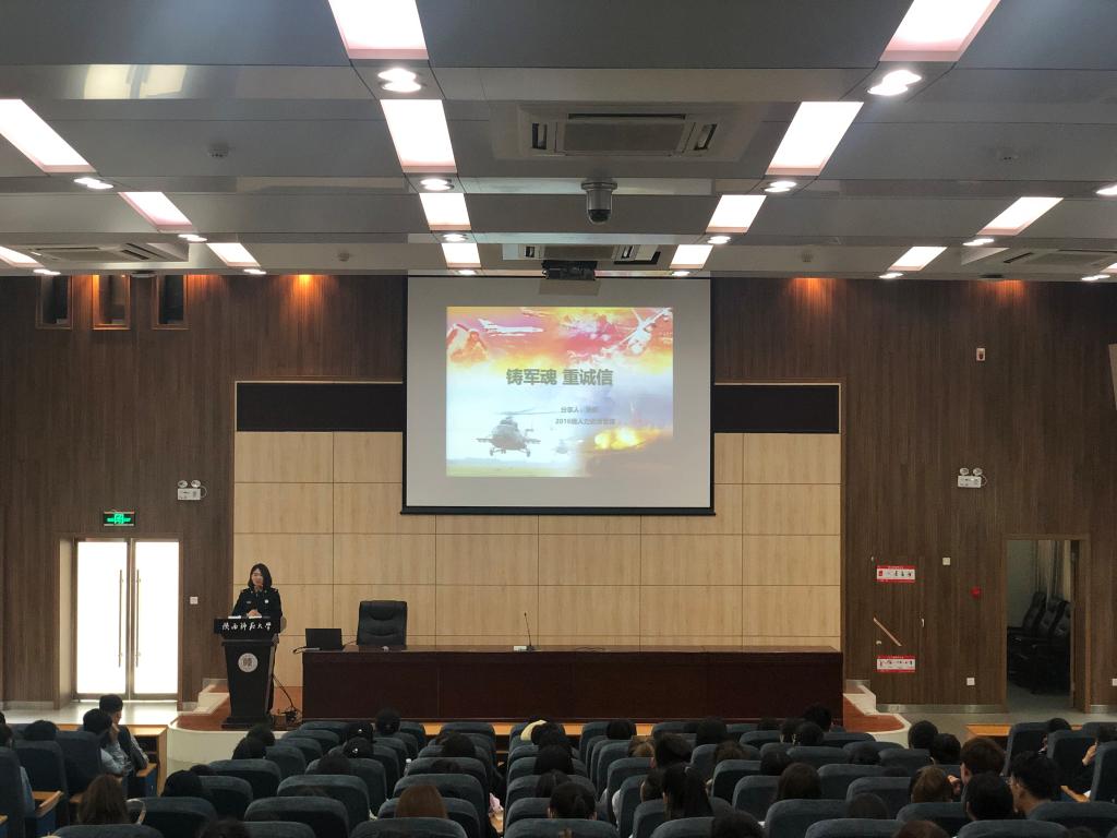 4月23日中午,为做青年好学生诚信教育工作,在人民海军成立70周年之际,3003新葡官方网站组织本科生开展了诚信主题报告,邀请了我校2016级人力资源管理专业本科生张昕作为报告人,结合其志愿参与大学生征兵的典型事迹带来了题为“铸军魂·重诚信”的主题报告。学院团委书记宋娜,辅导员陈杰、赵磊以及230余名本科生参与了本次报告,报告由陈杰主持。