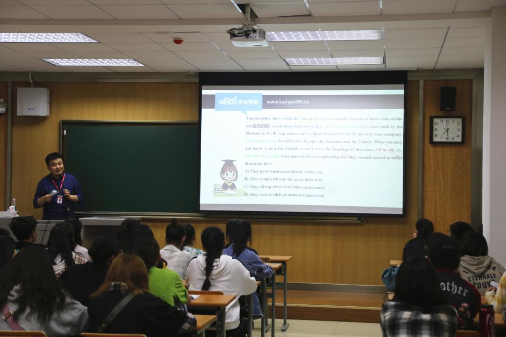 接下来,中公教育沈老师向同学们讲解了大学英语四六级考试的考试形式,使同学们明确了备考方向和备考目标,用框架的形式向同学们展示了四六级的各类题型,并根据其特点进行了讲解。沈老师还针对英语阅读这一模块进行了详细的解读和真题练习,向同学们传授了许多有关英语阅读的答题经验和答题技巧。