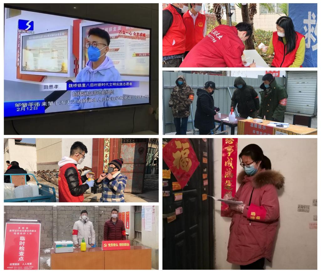 投身战“疫”,主动出击,积极参与基层防控。自疫情开始以来,3003新葡官方网站青年学生在做好自我防控的同时,不忘初心,勇挑担当,肩负起新时代大学生的时代责任和历史使命,纷纷响应地方防控工作需求,主动走上街头,走进社区,走入村落,向广大群众宣传普及相关政策和防疫措施,悉心指导如何正确使用防护用品,为打赢疫情阻击战贡献力量。2017级本科生、学院学生会副主席田恩孝作为一名学生党员,在家乡积极参与防控工作,安装防护设施,张贴防控通知,定时巡逻执勤,向群众宣讲疫情防控期间的注意事项,并为基层组织出谋划策,配合开展了秀厨艺、才艺大比拼、最美庭院评比等活动。他的事迹被今日头条、齐鲁网、大众网、滨州网、邹平融媒等媒体报道。此外,2018级研究生夏振宇,2019级本科生刘洋辰等一批学生也积极参与到当地疫情防控工作中,践行守望相助,共克疫情难关。