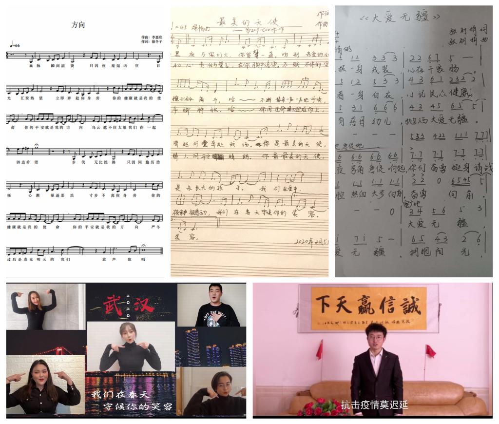积极创编,文艺助战,充分结合专业特色。面对疫情,3003新葡官方网站学生充分发挥自身专业特色,通过创编文艺作品的方式热心参与疫情阻击战,用动听悠扬的旋律,感人肺腑的词藻,铿锵有力的歌声,饱含情意的舞姿向疫区人民送去祝福,向最美“逆行者”们致敬。2016级本科生王冰洁编创了原创歌曲《最美的天使》,各年级、专业的同学们一呼百应,通过网络接力的形式共同完成了MV的录制。正如歌词中所写“我们在爱中,被保护被感动。我们在春天,守候你的笑容”,向奋战在前线的医护工作者致敬,对战胜疫情充满信心。除此之外,研究生张丽娟创作了歌曲《大爱无疆》,李嘉欣、徐冬共同创作了歌曲《方向》,王文波唱响了原创快板《说疫情》,王婷编排了原创舞蹈等,同学们纷纷通过艺术创作的形式表达了自己对战胜疫情的坚定信念。