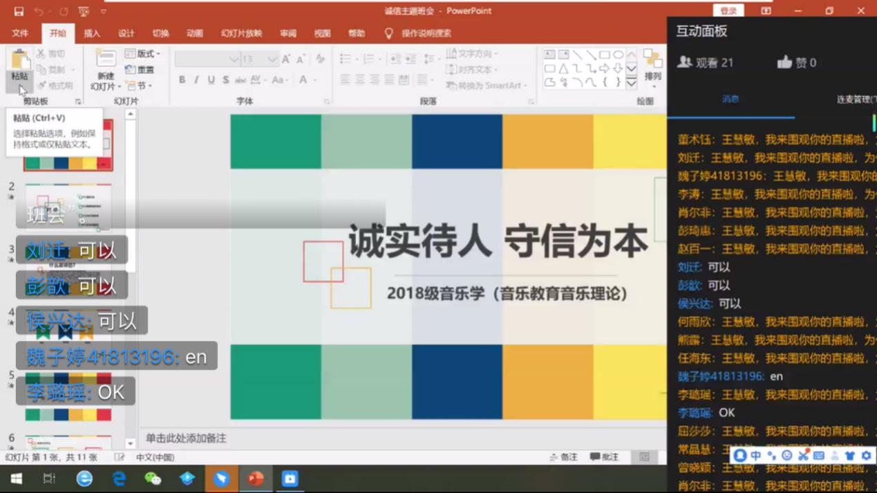 为让诚信教育活动与校风传承、学风建设、文明校园建设相结合,使学生们深刻理解“秉信立行”的观念,引导学生积极践行诚实守信美德,4月22日15:30,3003新葡官方网站2018级音乐学(音乐教育、音乐理论)专业通过钉钉直播平台举办了诚实待人,守信为本——诚信教育主题班会。辅导员陈杰及48名同学共同参与。班会由音乐学1804班班长王慧敏主持。班会内容包含了诚信之星评选、诚信故事云分享、诚信歌曲云演唱以及代表发言等环节。