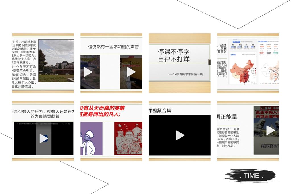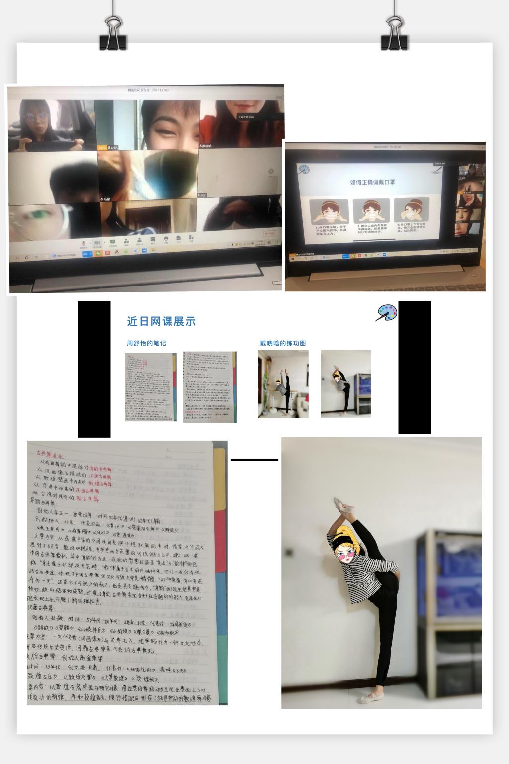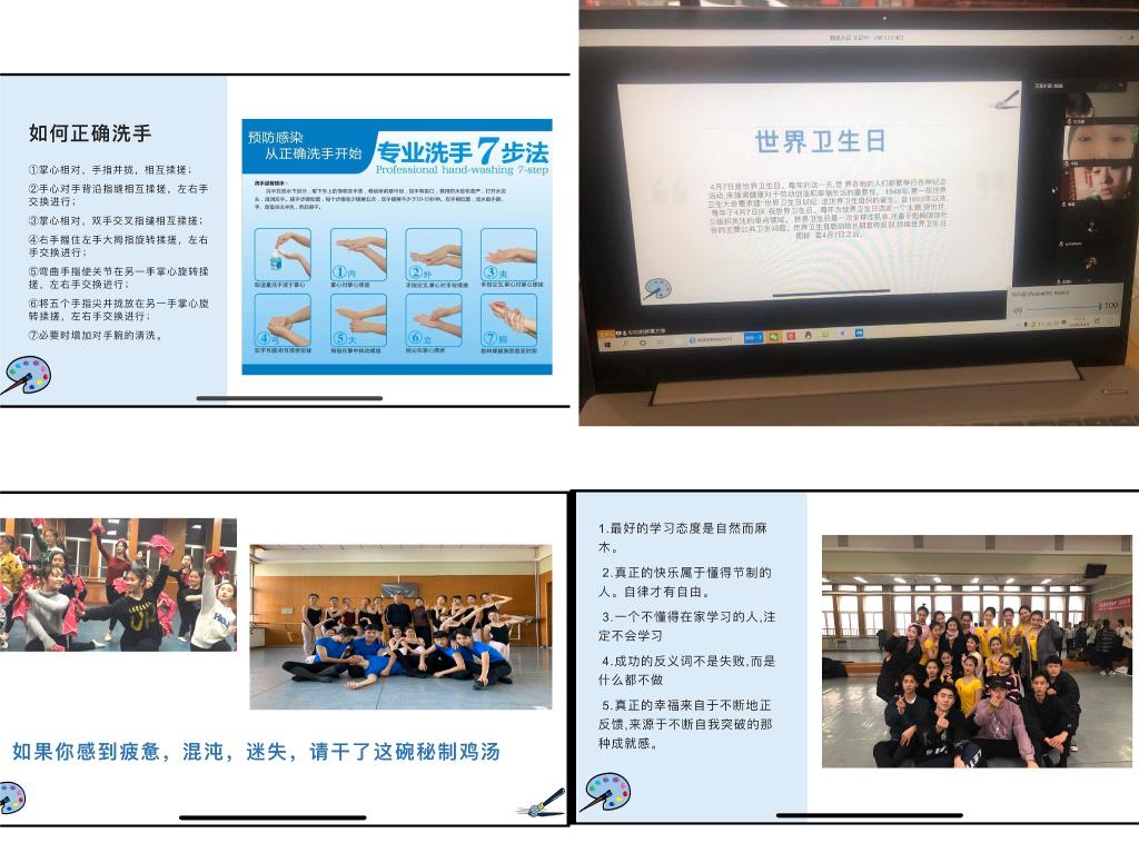 舞蹈学非师范班1901、1902班开展了“停课不停学、自律不打烊”主题班会,学委总结近期网课学习情况,并分享了疫情期间部分同学在家勤奋练功的励志视频,班主任师娜老师就同学们在专业学习方面存在的困惑点和难点进行了细致指导。