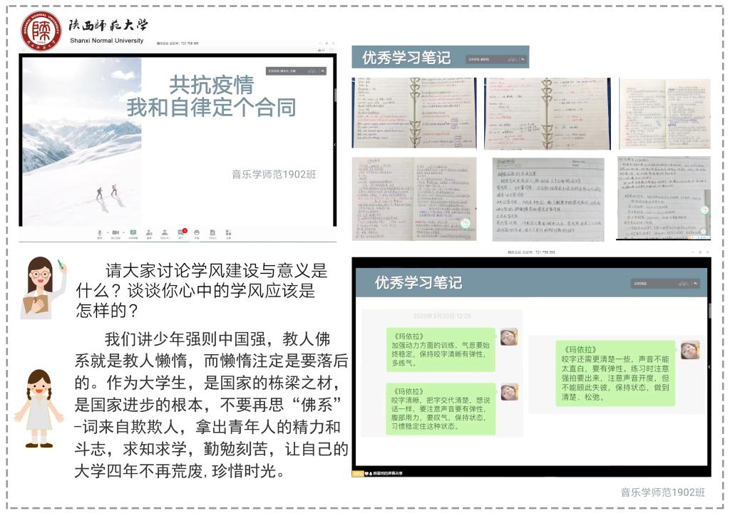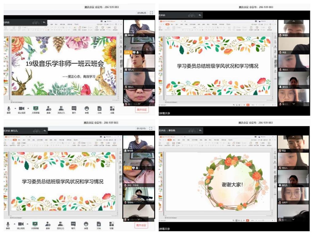 音乐学师范1901班和音乐学非师范班分别以“疫情时期的宅家学习指南”和“端正心态、高效学习”为主题分别开展了班会,经过交流,同学们在线上学习资料利用、学习软件使用方法以及宅家状态调整方面都获益匪浅。辅导员薛凡凡在每场班会结束前进行总结发言,她提醒同学们正视上学期的期末成绩,重视补考复习,迅速调整状态,掌握科学的学习方法,以坚如磐石的信心、只争朝夕的劲头、坚韧不拔的毅力投入到今后的学习生活中。