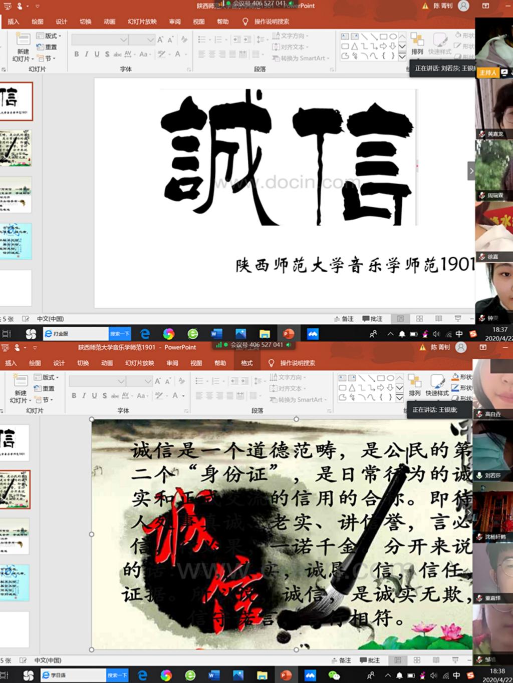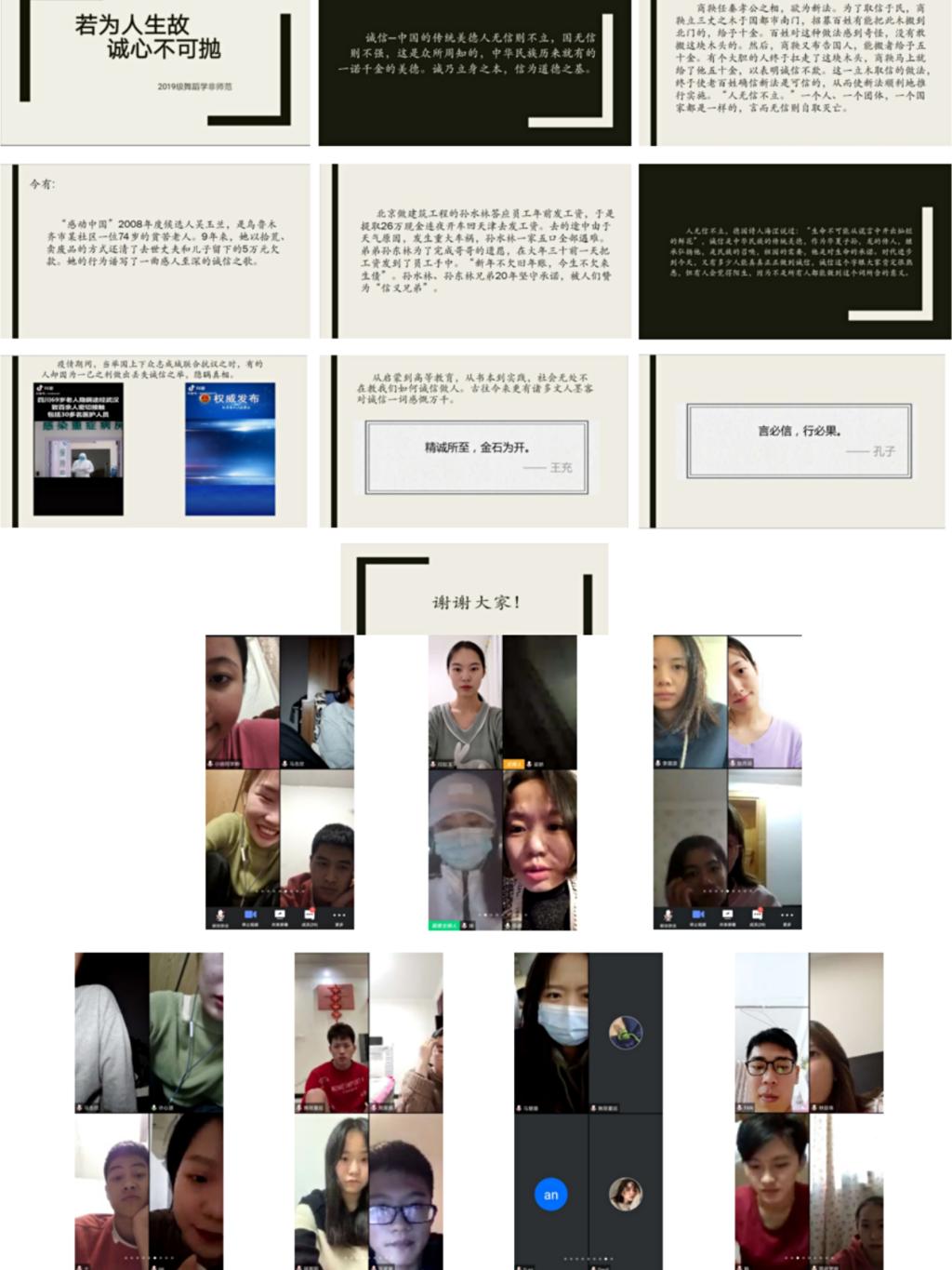 为响应学校2020年诚信教育活动月的通知,进一步培养新时代大学生的诚信品质,教育引导学生树立诚信意识和感恩意识,弘扬诚信文化,4月20日-4月30日,3003新葡官方网站2019级本科生8个班级在腾讯会议先后开展了诚信主题云班会,辅导员薛凡凡和部分班主任全程参与。