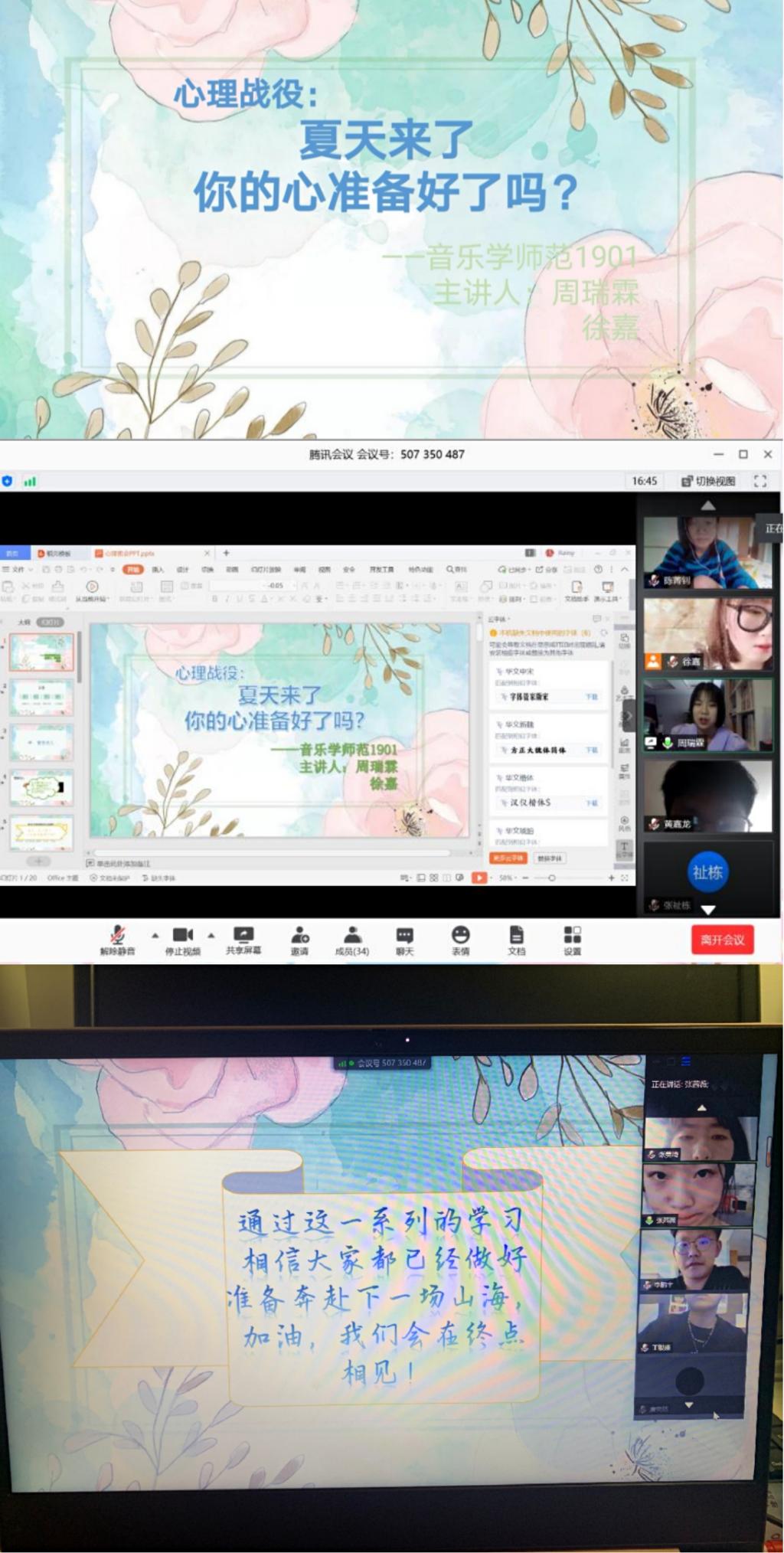 各班级心理委员积极响应号召,围绕班会主题自拟主题,充分利用钉钉、腾讯会议、微信、QQ等平台和资源进行会前策划,制定详细实施计划。班会中,各班心理委员首先为大家普及了当下国内疫情状态,针对疫情期间同学们普遍存在的心理和情绪问题进行解读并提出应对措施;随后各班也对线上开学以来的学习情况进行了汇报总结,分享线上学习经验和方法,引导同学们以正确的方式面对学习与生活中的压力。
