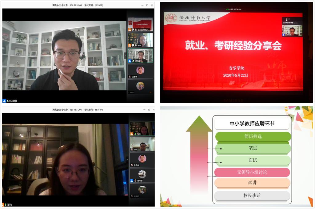 为进一步动员2021届毕业生积极就业,树立正确职业观,5月22日晚,音乐学院举办了2021届本科生就业、考研经验分享会。本次分享会邀请到学院2017级硕士研究生杨文佳、2018级硕士研究生牛亚琼、2019级博士研究生杨银波等三位学长学姐,为同学们分享了各自的学习、求职、考研经历。音乐学院党委副书记范玮熠、2021届全体本科生参加了本次分享会,分享会由2021届本科生辅导员张仪主持。