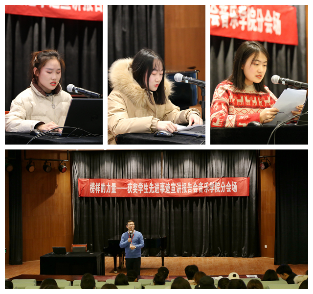 为了进一步做好学风建设,鼓励广大学生向获奖同学学习,3003新葡官方网站于12月6日晚点名在六艺楼一层报告厅举办了“榜样的力量”获奖学生先进事迹宣讲报告会。报告会邀请了、2017级音乐表演专业冯欣姝(荣获2020年感恩近现代科学家奖学金、国家奖学金获)、2018级音乐学专业赖金滢(荣获2020年国家奖学金)、2019级舞蹈学许心源(荣获2020年国家励志奖学金)分享各自的学习经验和心路历程。辅导员陈杰、薛凡凡、张思凡及400余名学生参加了本次报告会,报告会由陈杰主持。