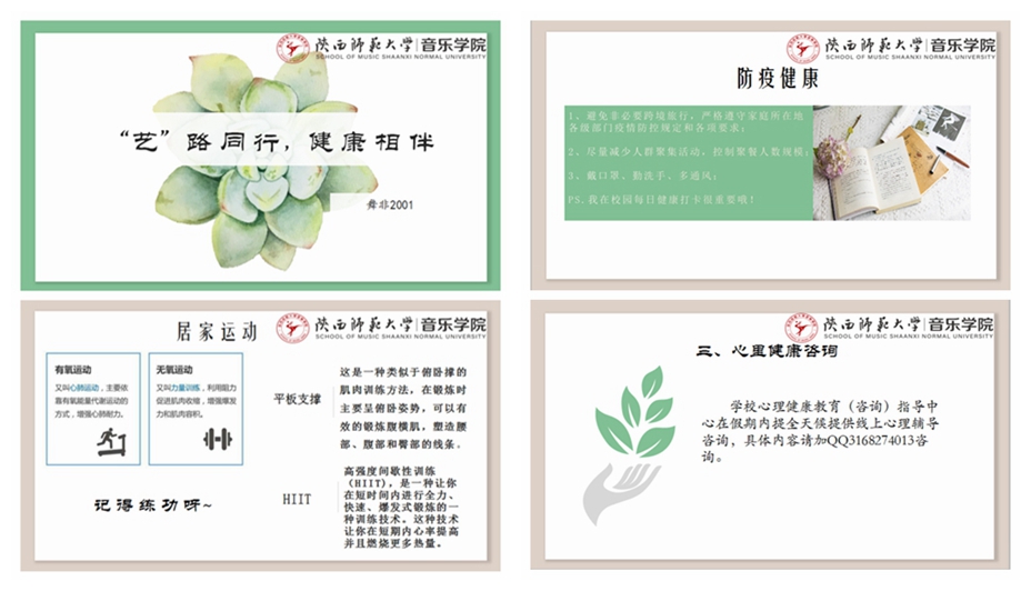 舞蹈学(非师范)2001班开展“艺路同行,健康相伴”主题云班会。首先,班长高水柳经过前期调查分析大学生中出现的作息不规律、心理压力过大、不自信等问题,希望同学们提高对心理健康问题的关注,树立心理保健意识,保持积极良好的心理状态,为假期以及下学期开展学习生活做好准备。随后,在播放舒缓音乐的同时大家分享了各自的居家生活和一些缓解焦虑,减轻压力的方法,培养自己自尊自信、理性平和、积极向上的健康心态。最后,心理健康与身体健康都非常重要,树立每个人是自己第一责任人的意识,提倡大家居家练习基本功、健身,不放松警惕,少聚集,戴口罩等防疫小知识。