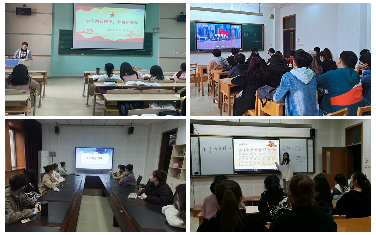 音乐学(音乐教育、音乐理论)2001班及音乐表演2001班结合“两会”学习活动开展主题团日活动,齐唱国歌,激发同学们爱党爱国爱社会主义的巨大热情。音乐学2001班班主任井碧媛老师结合两会相关内容,以及自身经历提出新学期、新期许,希望大家保持运动活力、增强担当意识、积极发现问题解决问题,优雅乐观的生活学习。音乐卓2002班将学习两会精神与党史学习相结合,全体同学积极讨论,分享感受。舞蹈专业学生开展学习两会精神主题班会,同学们表示将会从中汲取创作资源,创作讴歌党、讴歌祖国、讴歌人民、讴歌英雄的现实题材艺术作品。